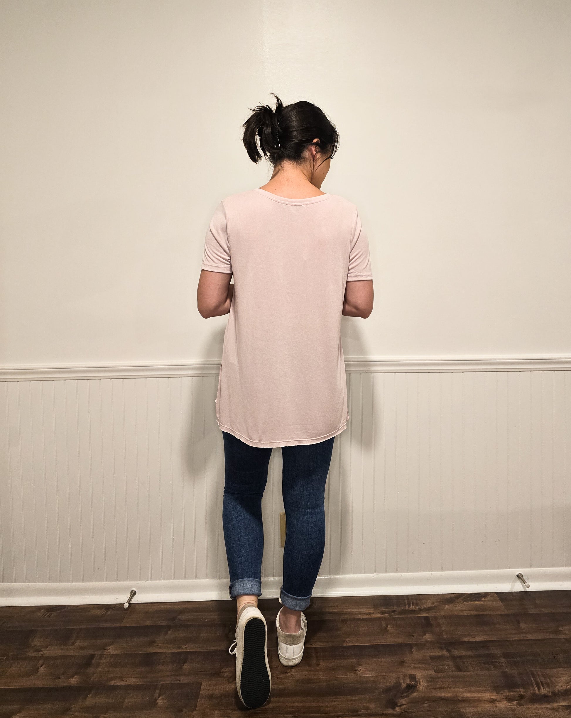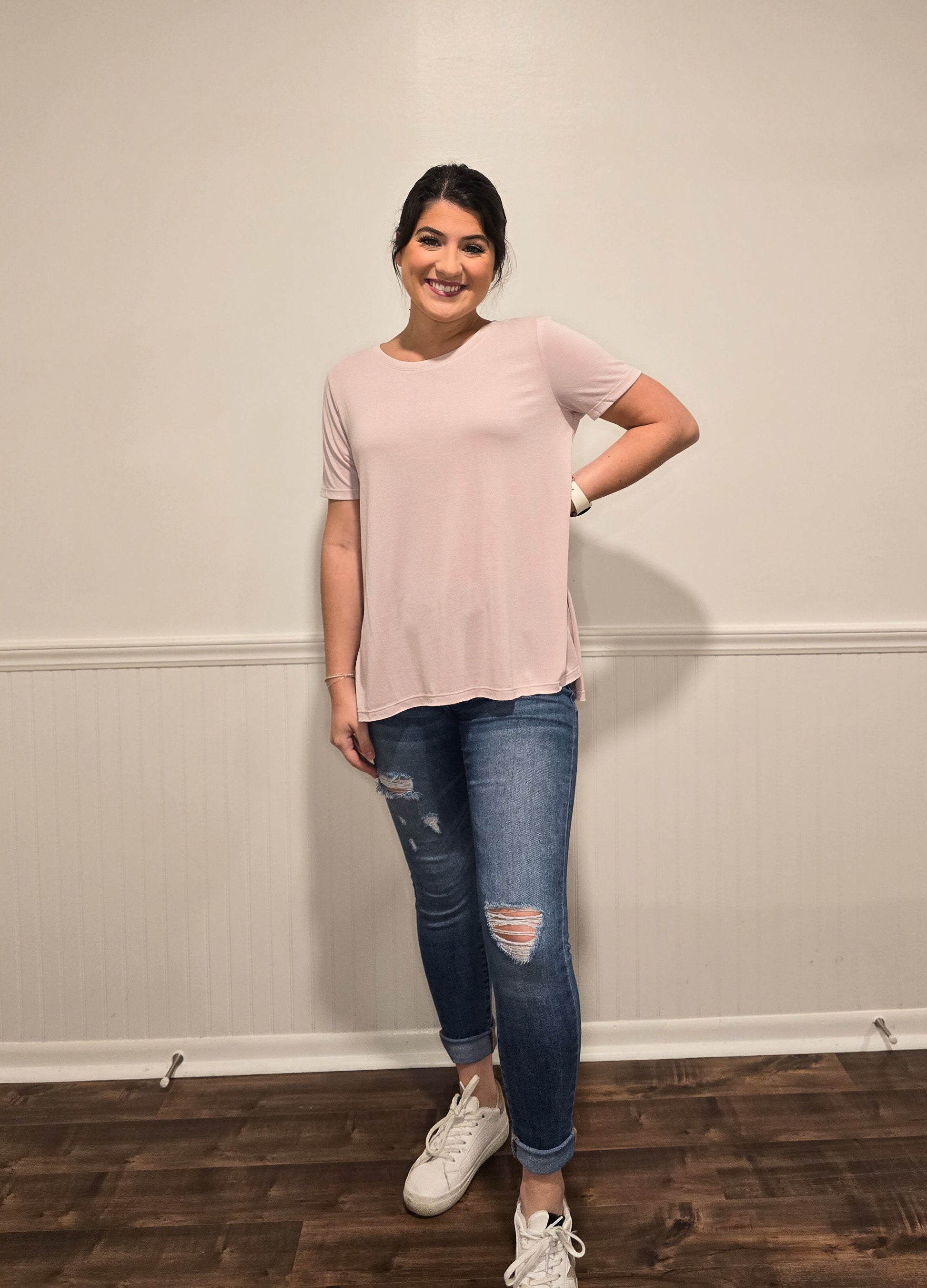 Who doesn't love a basic tee that goes with so much!! Perfect on its own and also great for going under layers when it gets cooler. It features a boat neckline and slits on side at bottom edges for a super flattering look. It is slightly longer in the back so it would pair great with leggings and give you the coverage you may want! It has a relaxed and flowy fit.