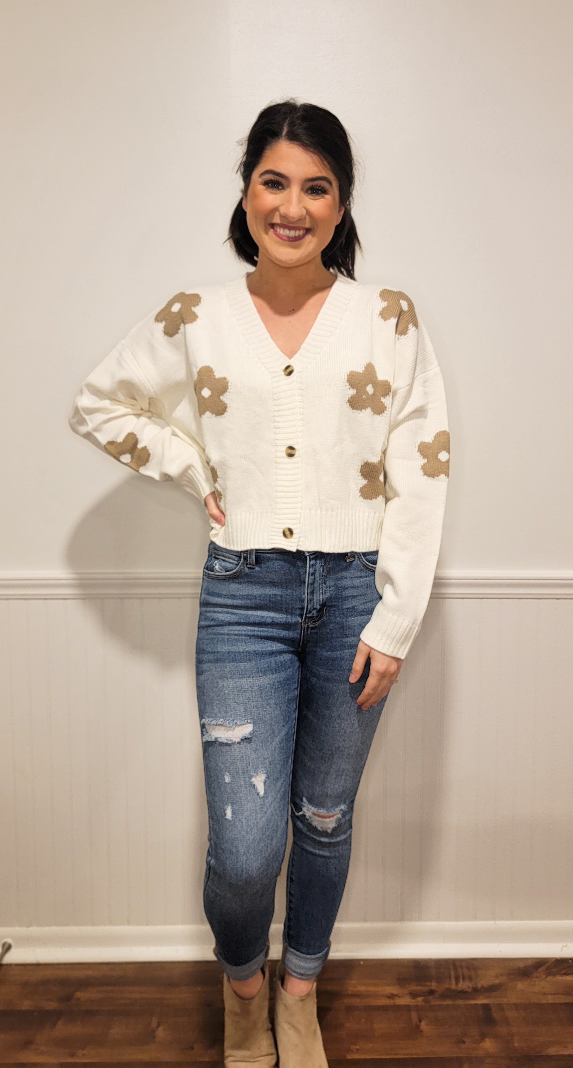 How cute is this cropped sweater!?! It has functional buttons and the cutest flowers! This lightweight sweater will be perfect for those breezy fall evenings.