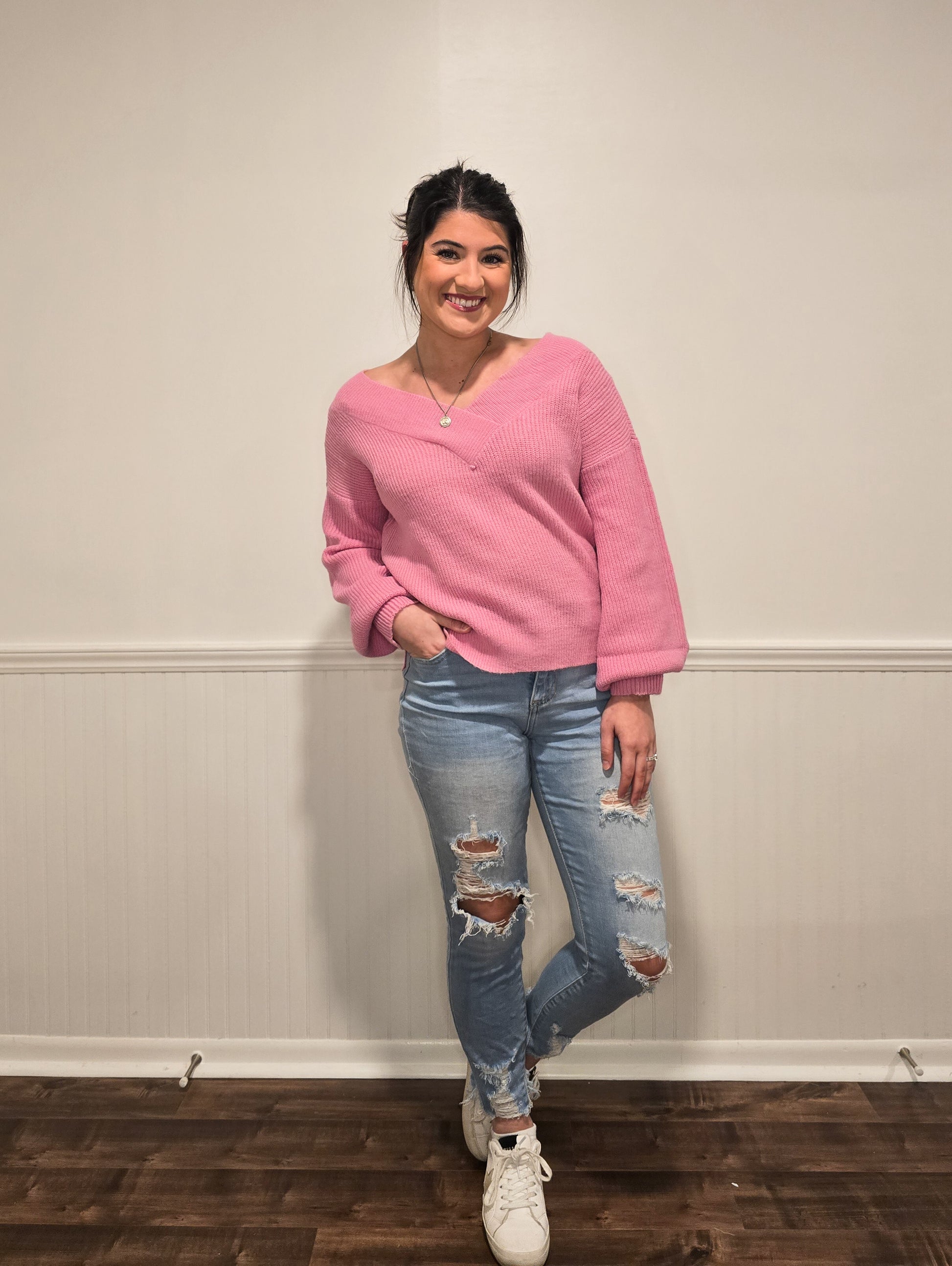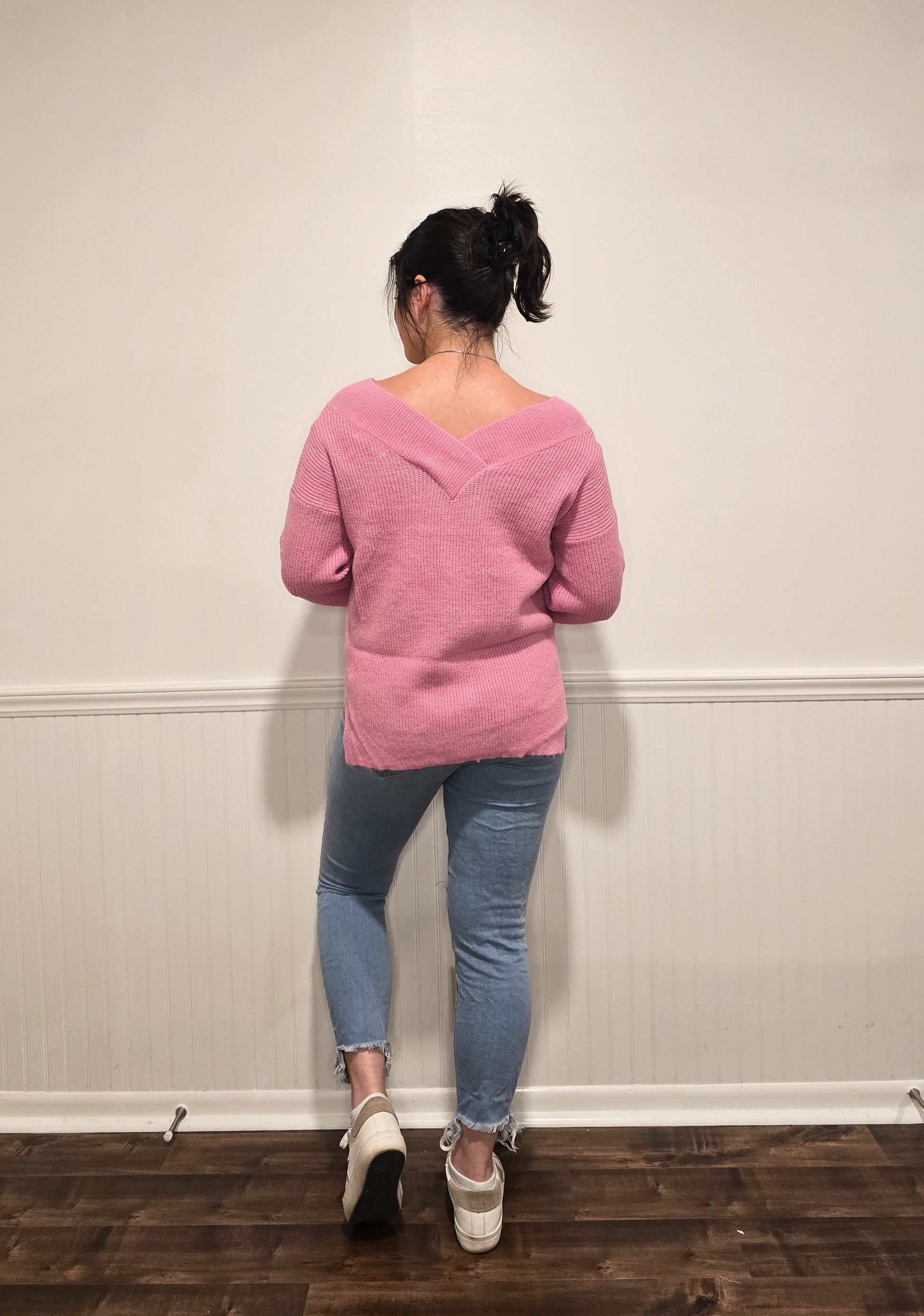 This adorable sweater is so comfy! It features a double (front and back) v-neckline. It has balloon sleeves to add the perfect amount of flare. It is longer in the back for some coverage and has slits on the sides. Perfectly paired with your favorite pair of denim or some comfy leggings!