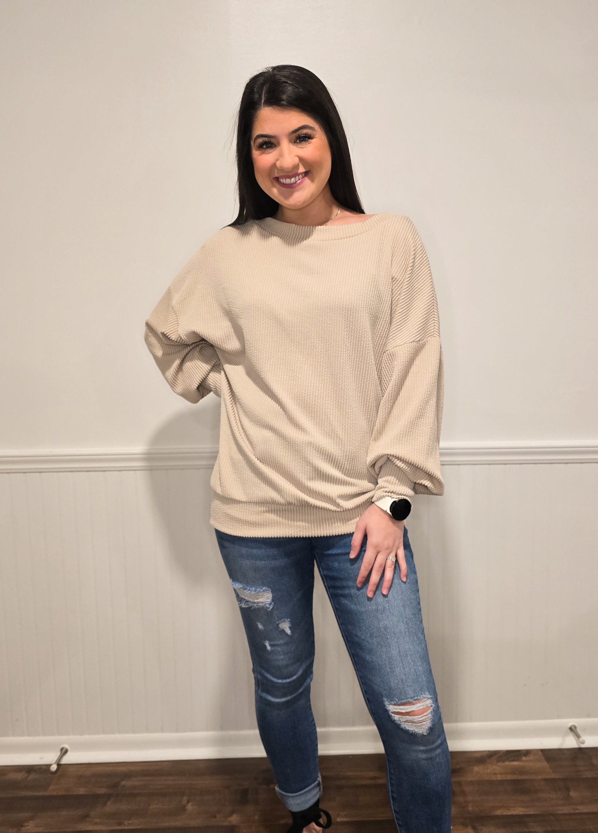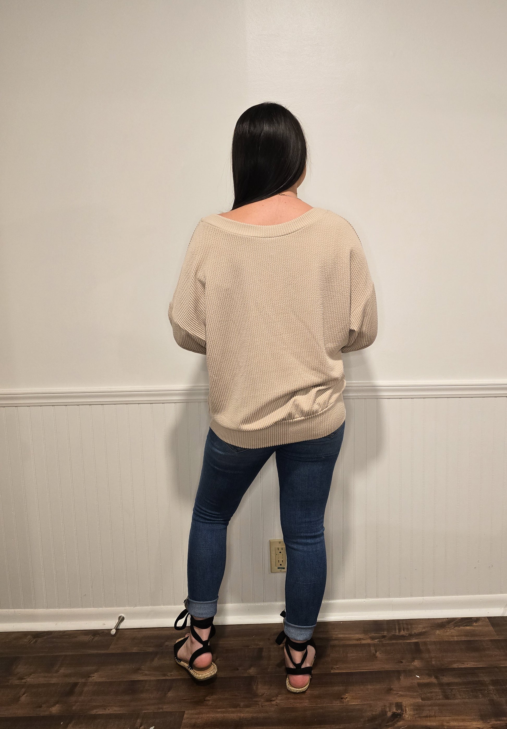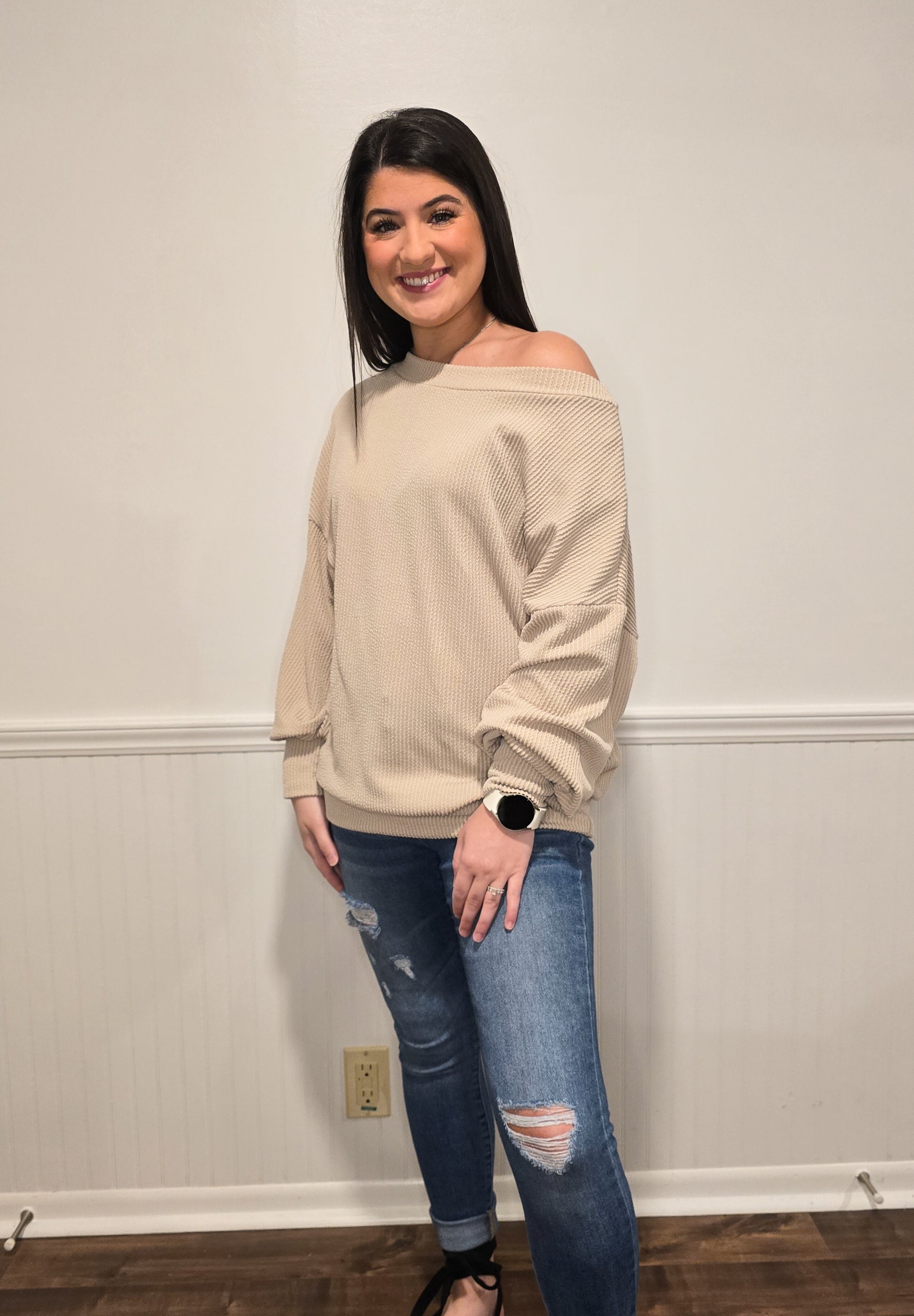 This ribbed knit sweater top is so comfy and can be worn like your average top or off one shoulder! It is cuffed and has an elastic band at the bottom hem. It has a relaxed loose silhouette for a comfortable fit.