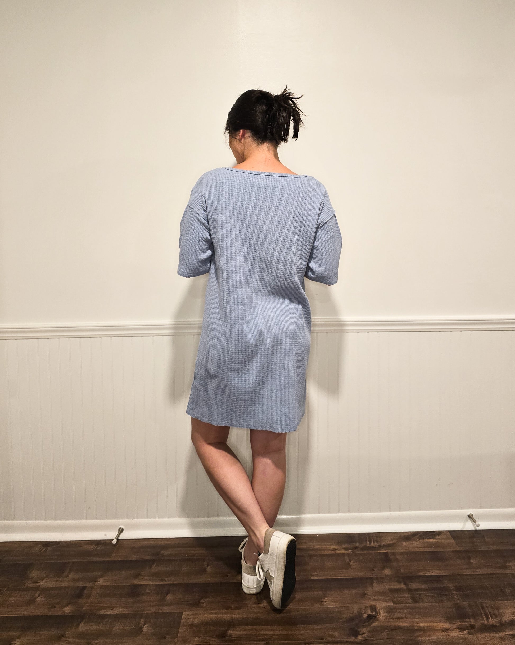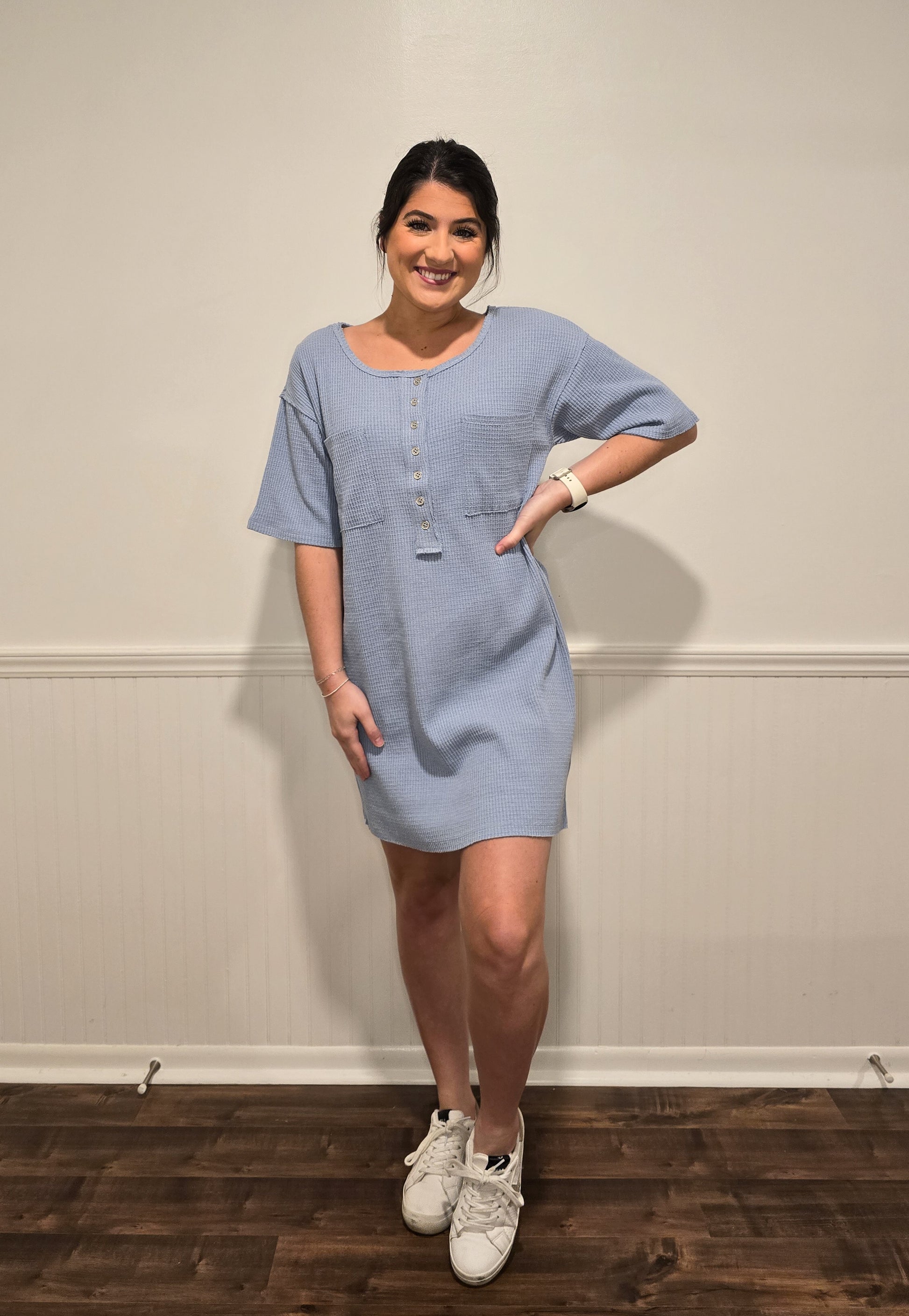 Throw on this lightweight waffle knit dress for the perfect casual look or dress it up with some accessories! It has a scoop neckline and short sleeves featuring button detail at bust. It also has double breast pockets.