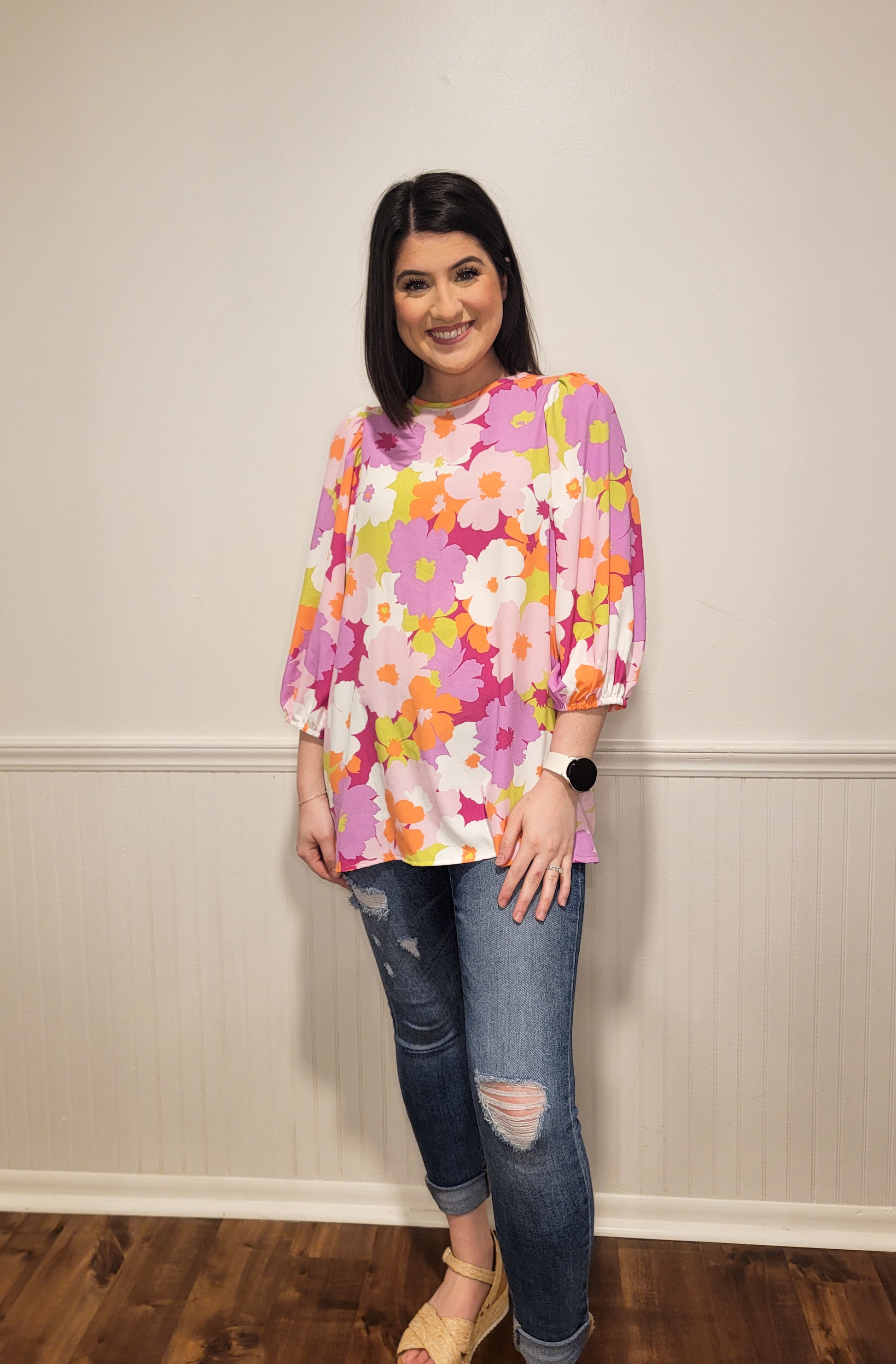 This 3/4 puff sleeve floral blouse is so good! It features elastic in wrists and back button keyhole closure. It has a relaxed and flattering fit.
