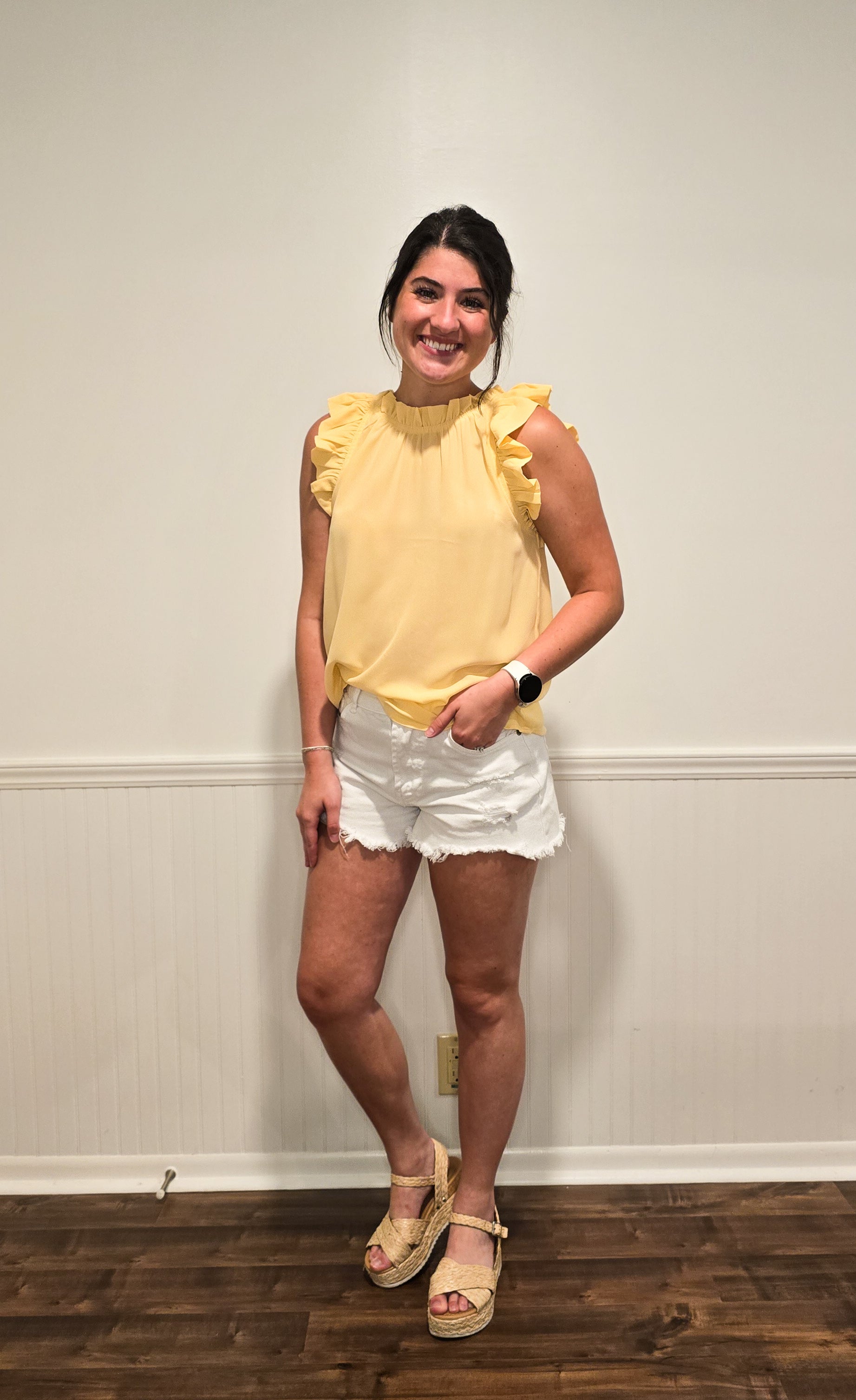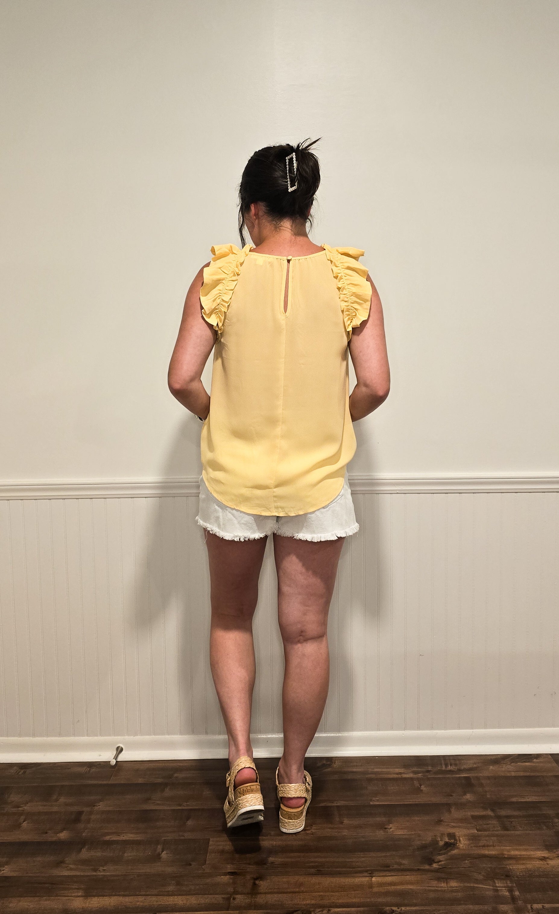 You need this adorable fluttery, ruffle tank in your closet! It is so lightweight and breathable. It features a round neckline with ruffles at the neck and sleeves. It also has a button closure with keyhole at the back.