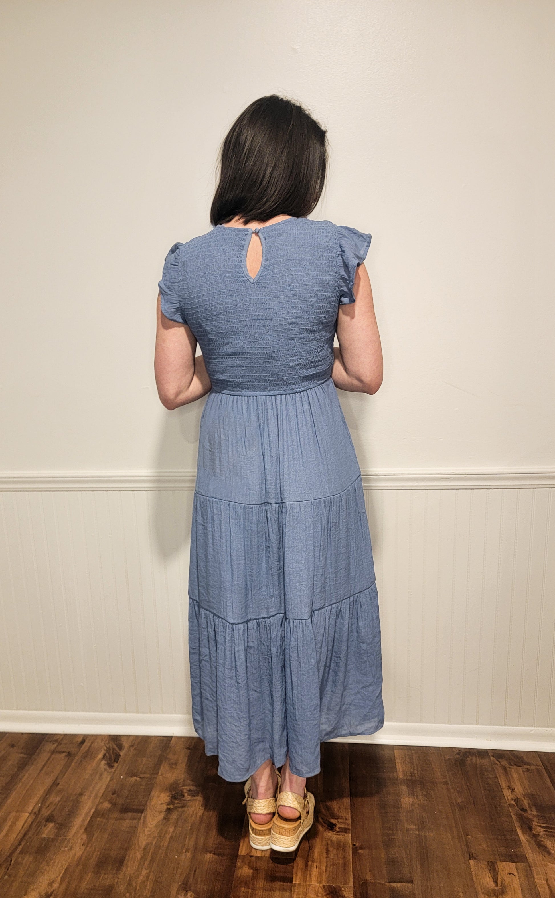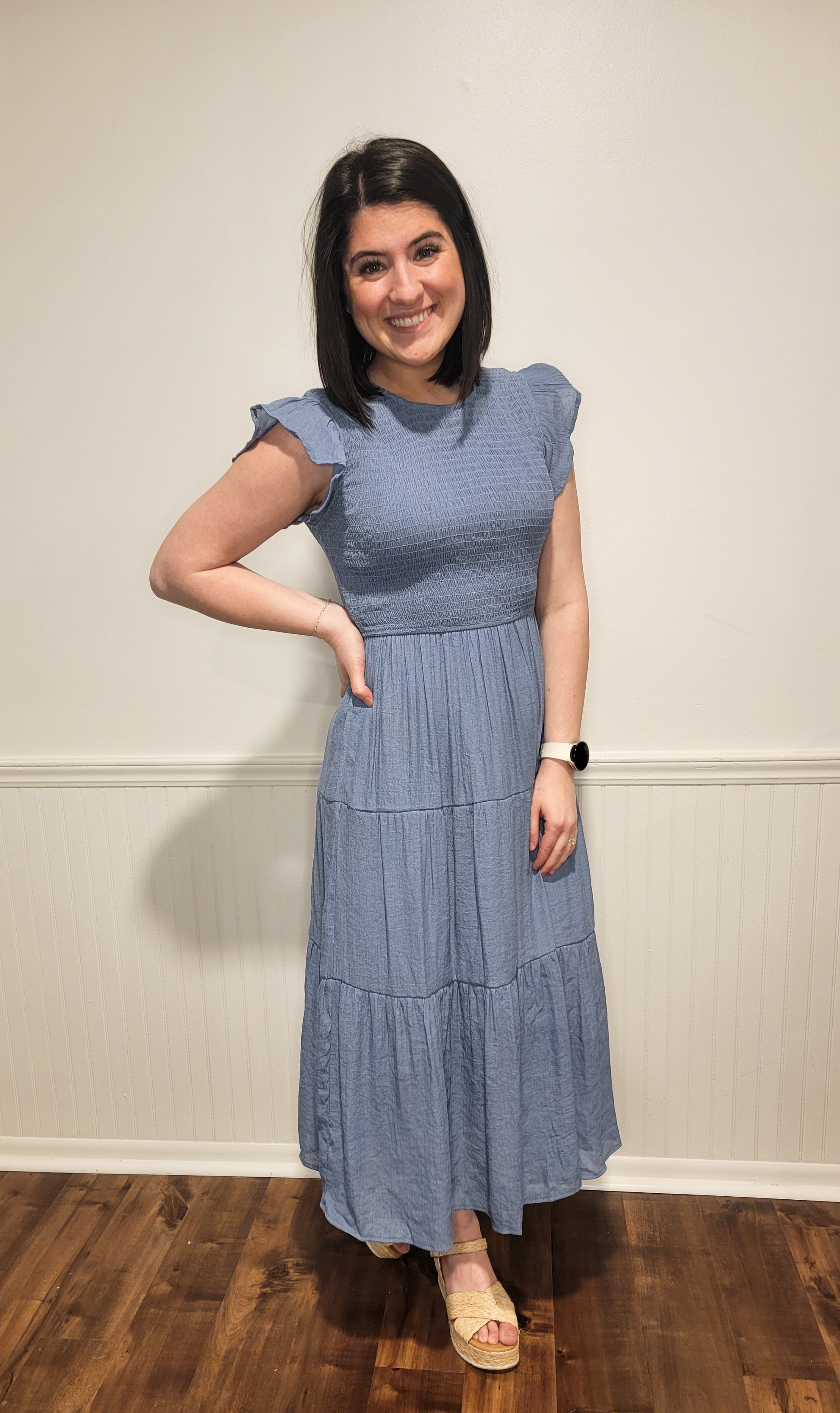 This adorable midi dress is perfect for so many occasions! Featuring a round neckline, short flutter cap sleeves and a smocked body, this dress is so flattering! It also has a back button up keyhole. It is lined.