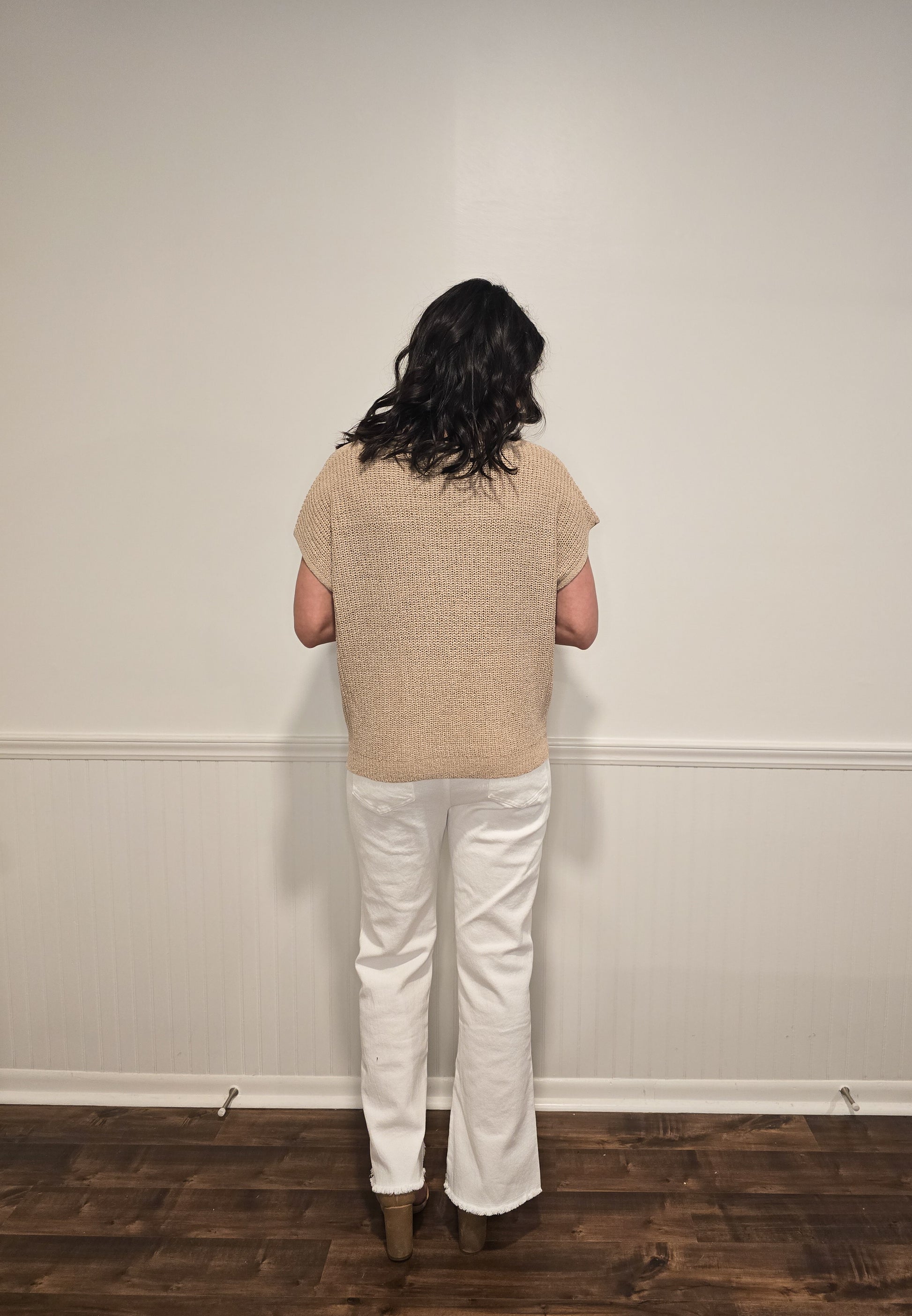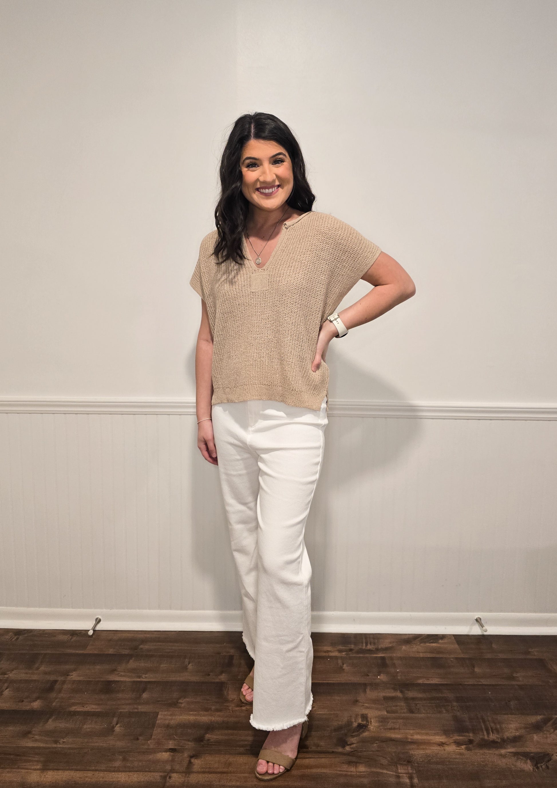 You need this comfy split neckline knit sweater top! It features raw edge detailing and short sleeves. Perfect for so many different occasions. It is not lined.