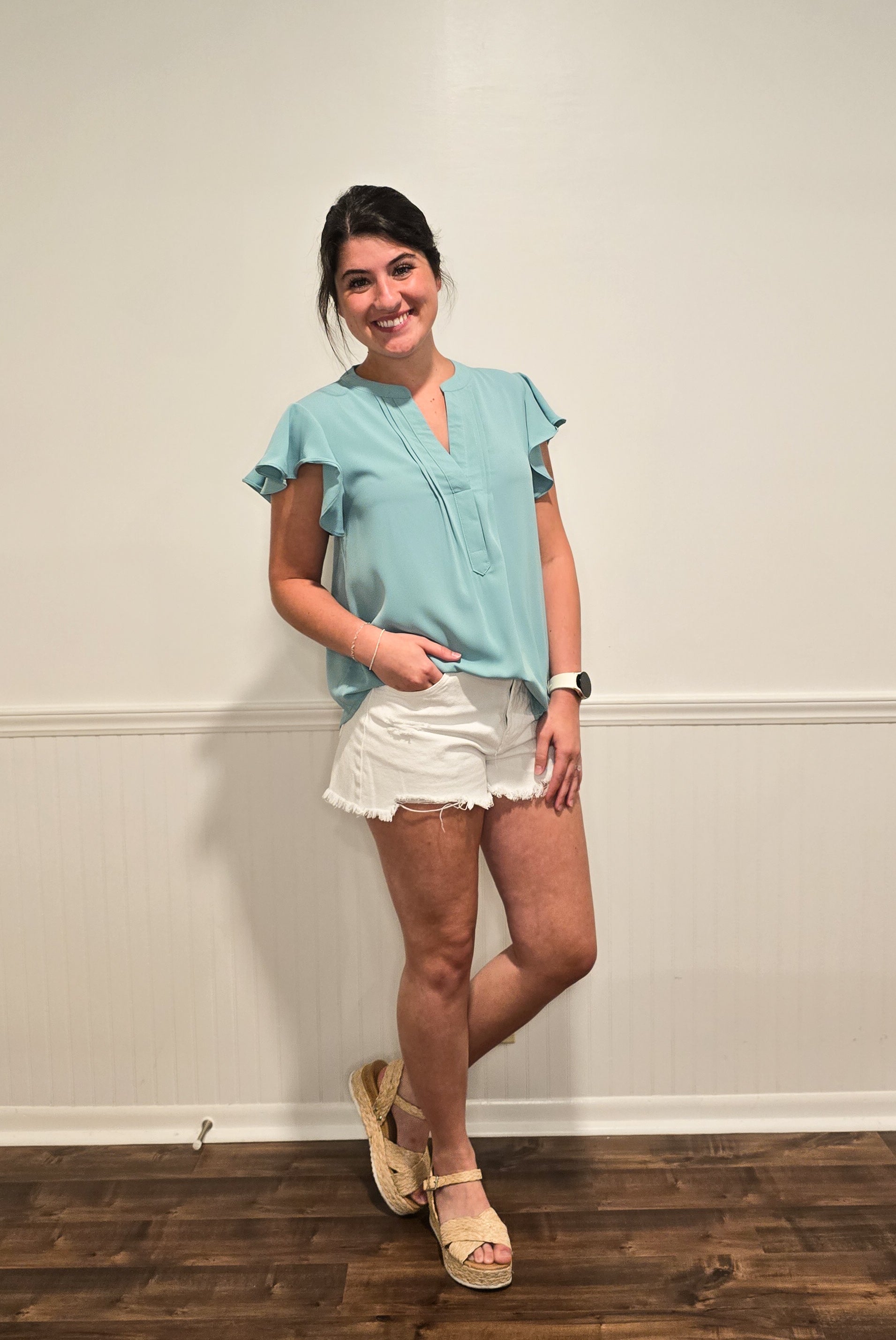 This precious flutter short sleeve top is PERFECT for all of the occasions! Great for work, date night, church, all the things! It features the perfect split neckline with front pleating details and a U-hemline.