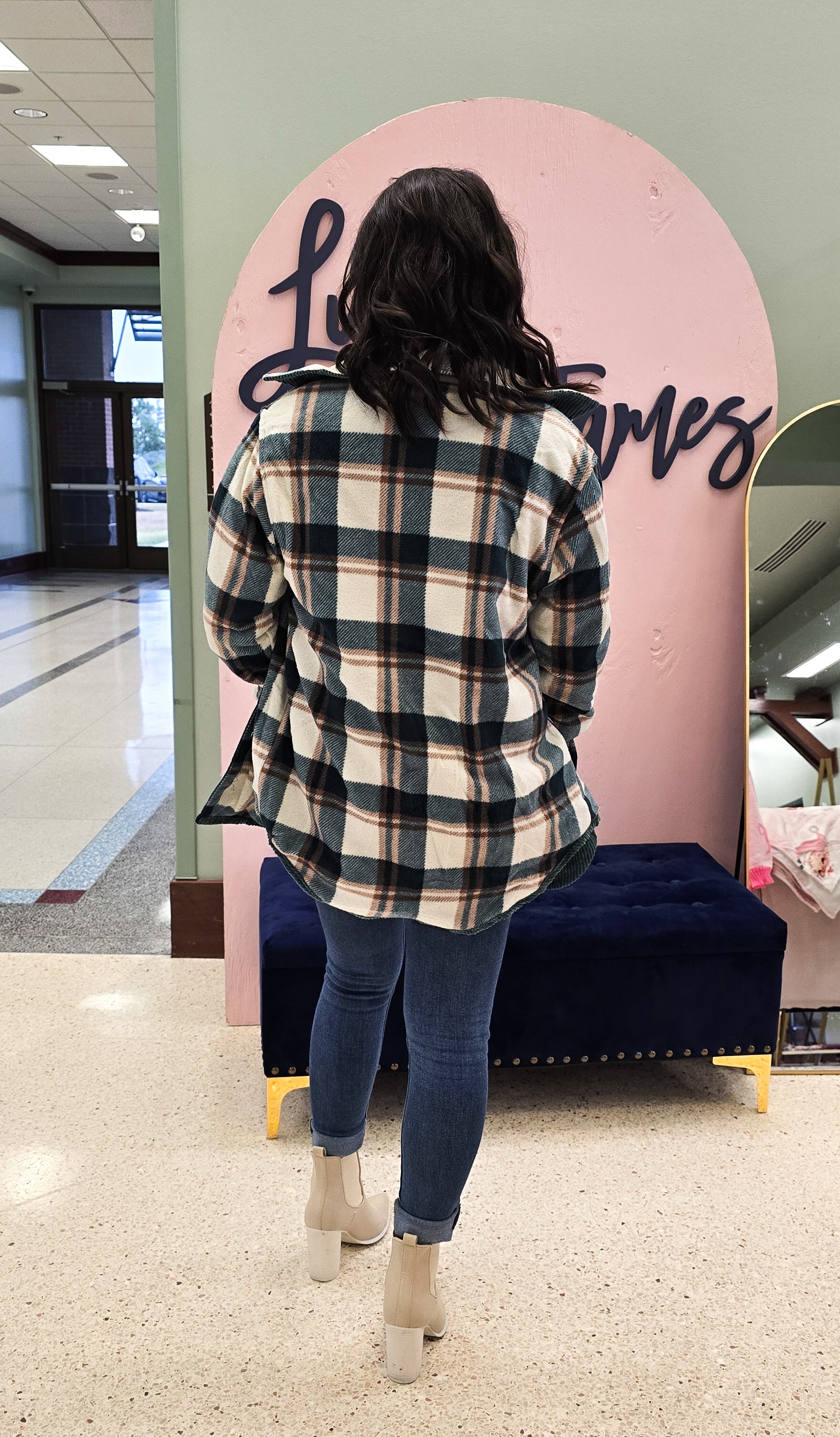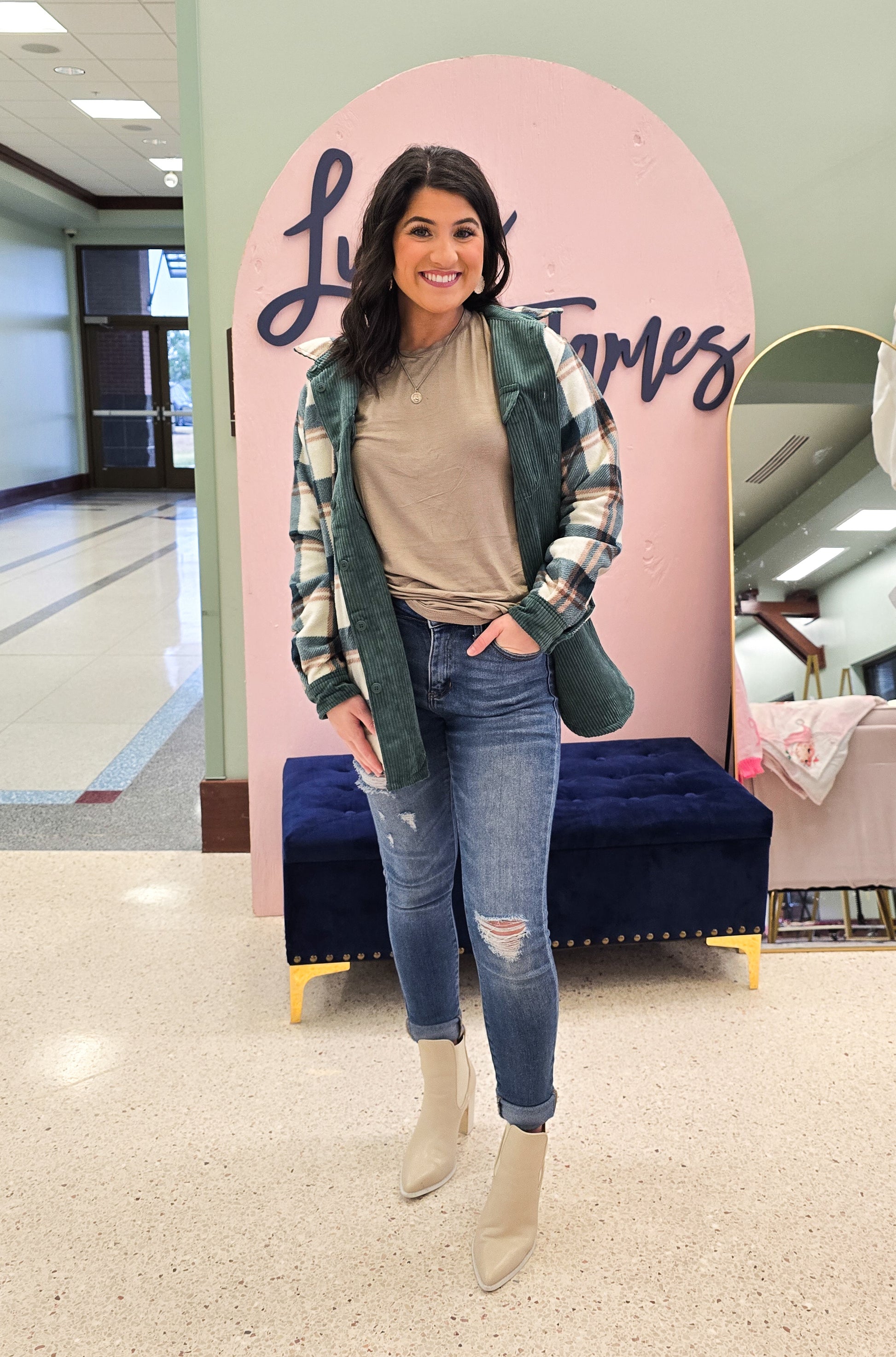 This shacket has "Fall" written all over it! This shacket takes versatility to the next level! This shacket is REVERSIBLE and features long sleeves, a collared neckline and breast pockets with corduroy on one side and a pink fleece plaid on the other.