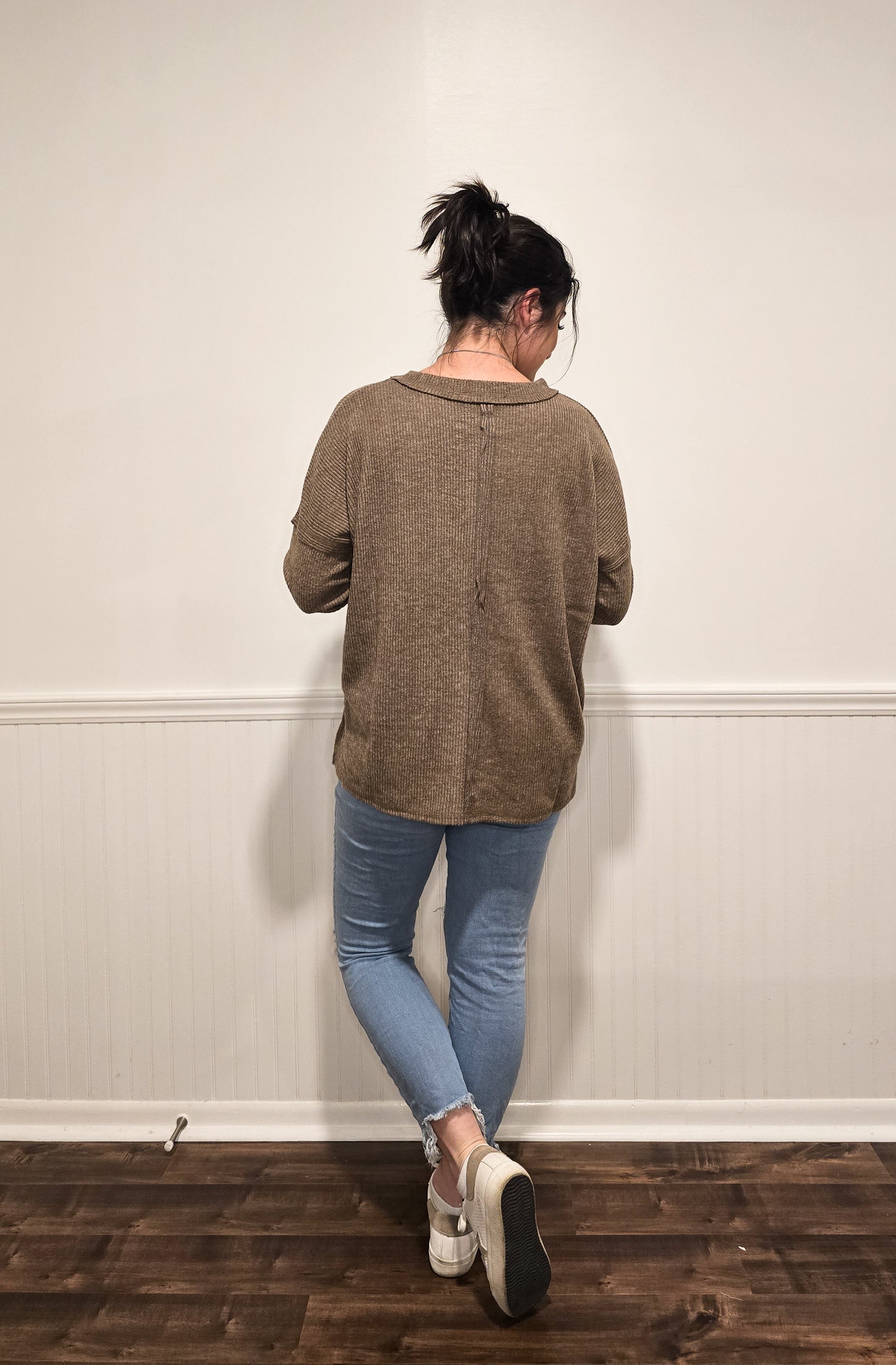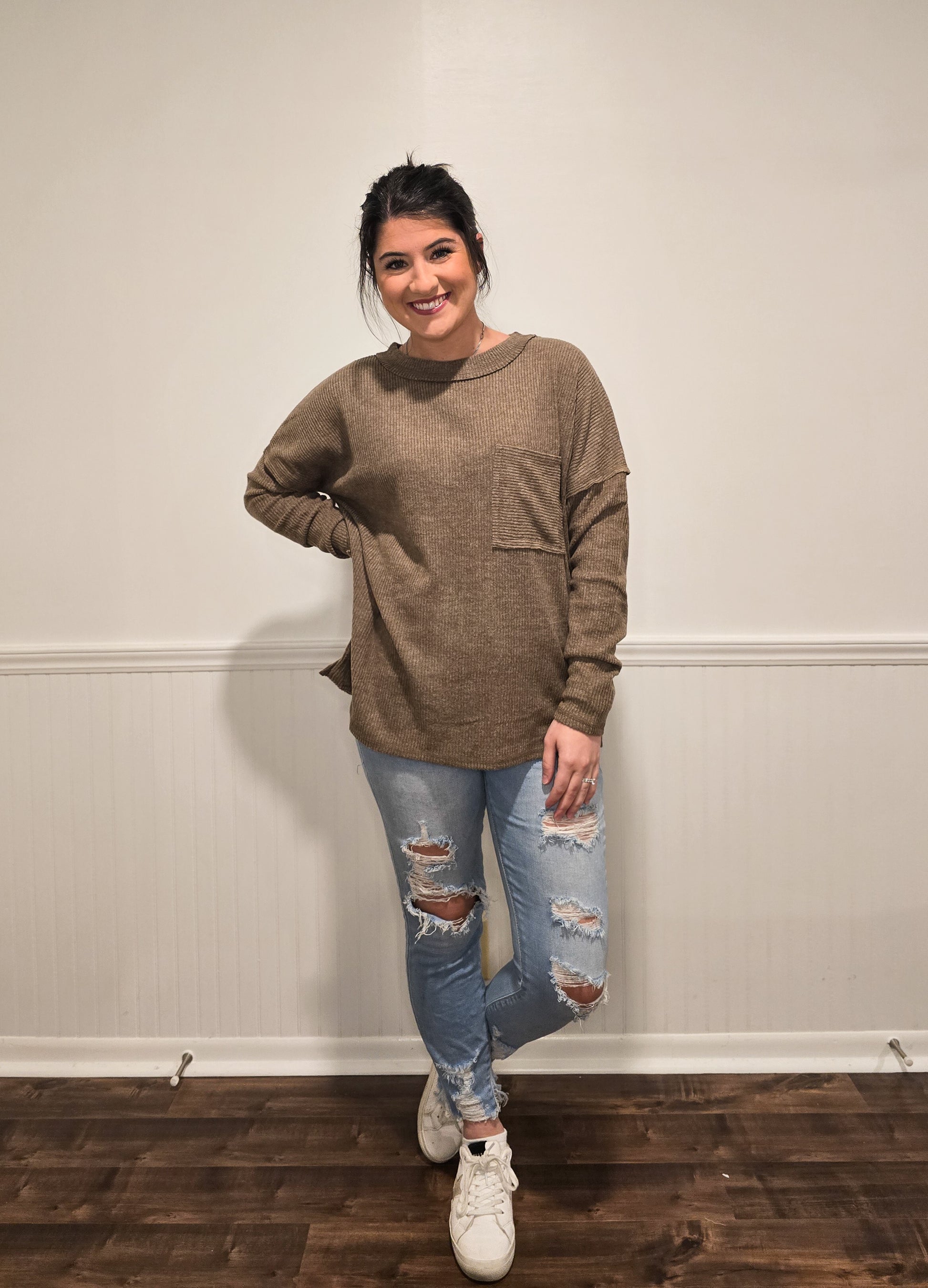 This ribbed sweater is perfect for your fall wardrobe! It features dropped shoulder seams and a breast pocket. It has a relaxed and a bit oversized fit. Perfect for cooler weather with leggings or some denim jeans!