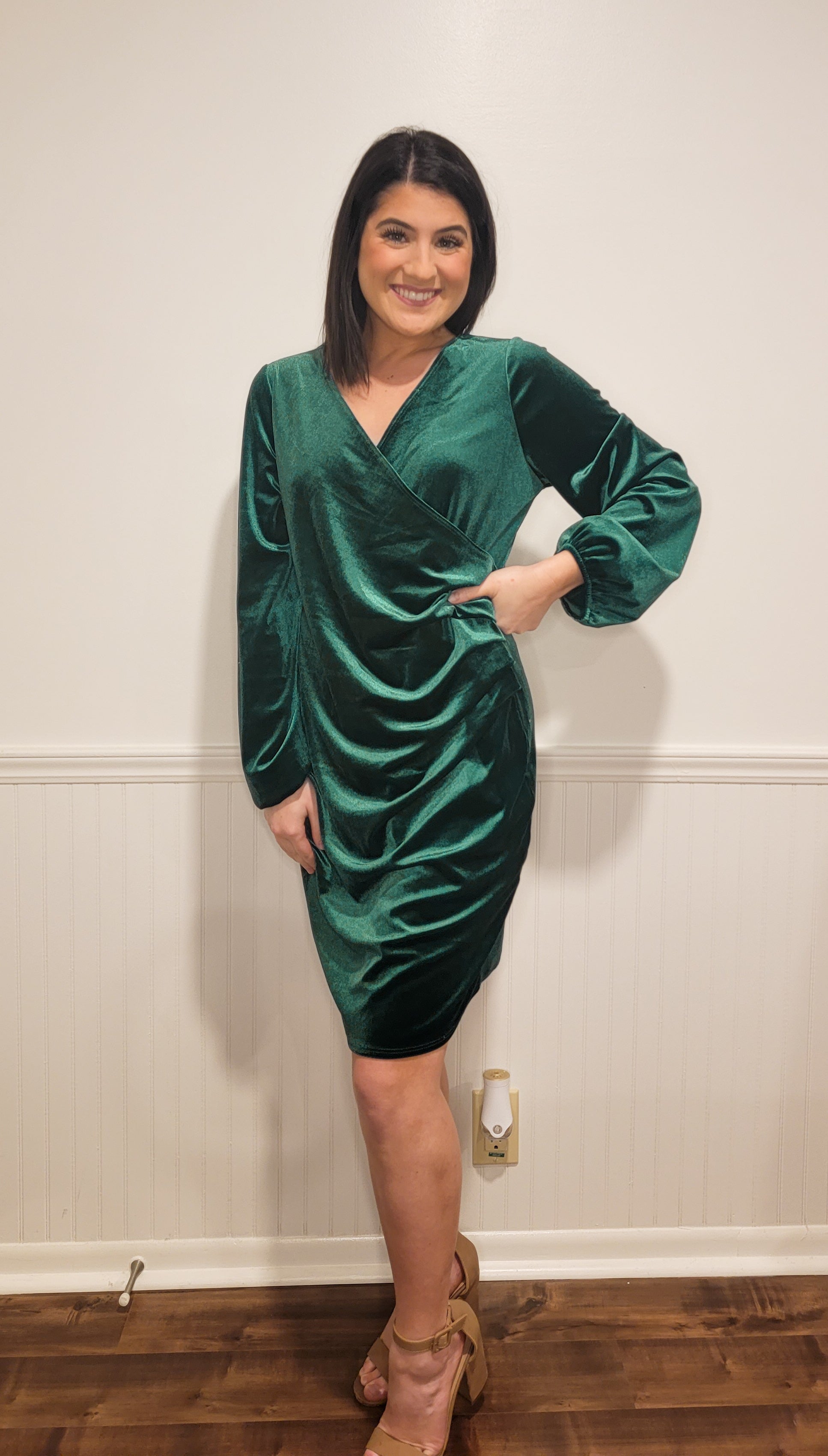 This rich velvet dress is a must have for the holidays! It has long sleeves with elastic at the wrists. It also has pleated detailing on the side for a flattering look.