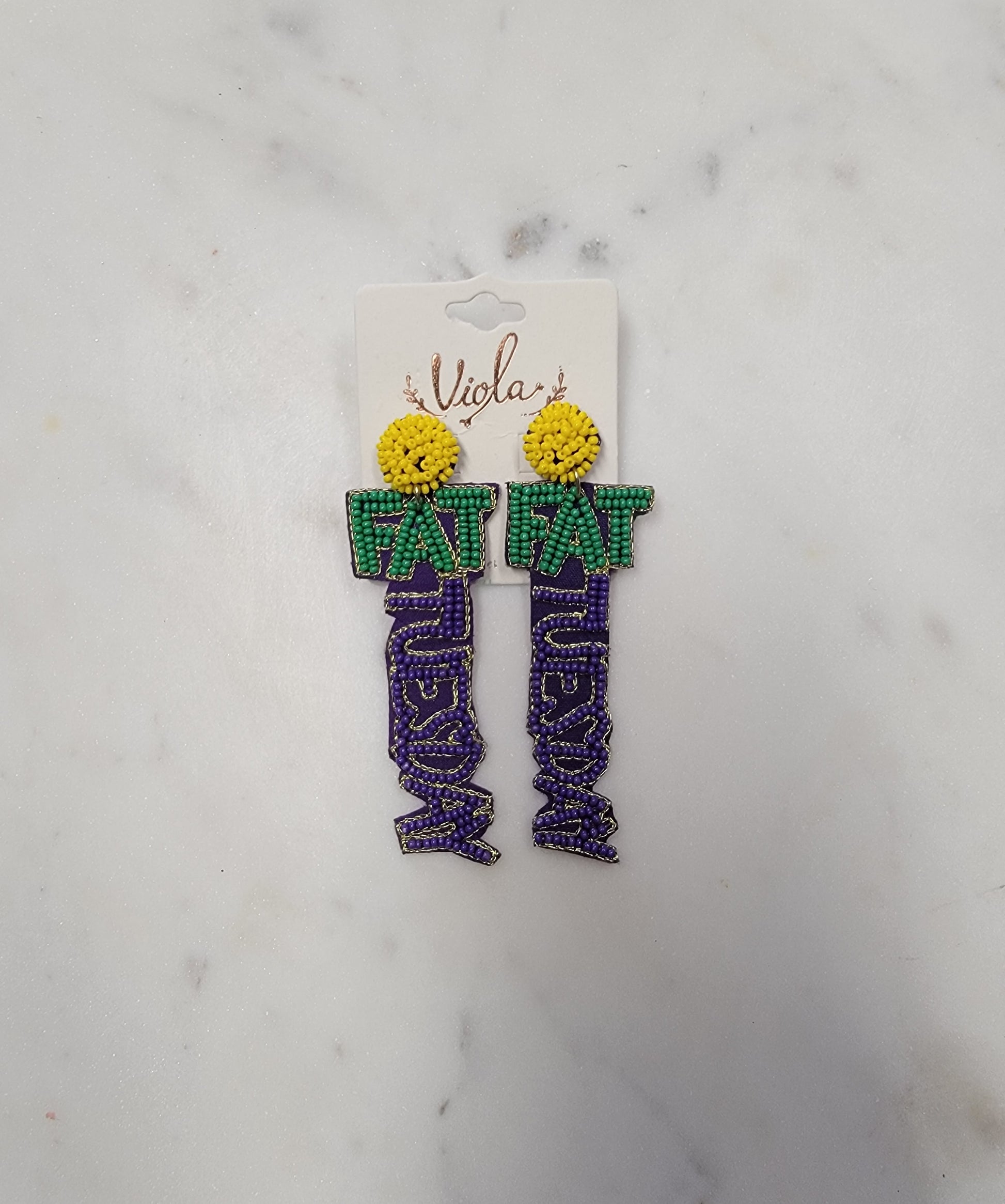 Fat Tuesday Vertical Text Beaded Long Drop Earrings