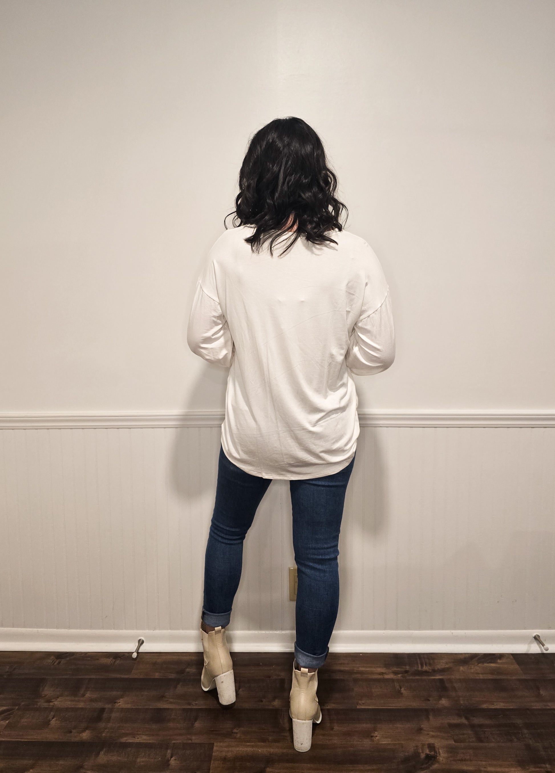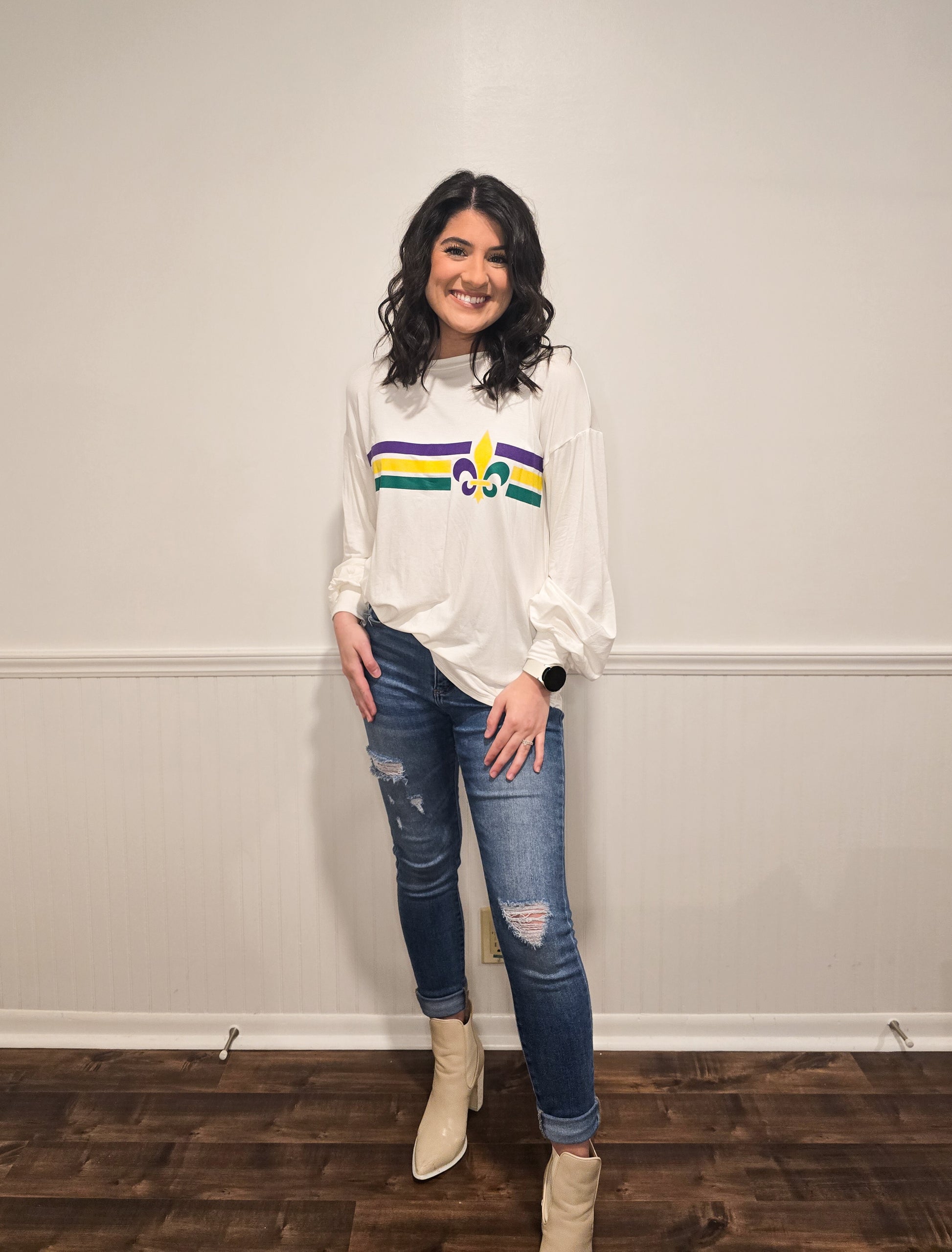 This lightweight long sleeve tee is perfect for Mardi Gras! This tee has a crew neckline and drop shoulder sleeves. It is so buttery soft and comfortable! Slightly oversized - size down for a more normal fit or order your regular size if you want it be a bit oversized.