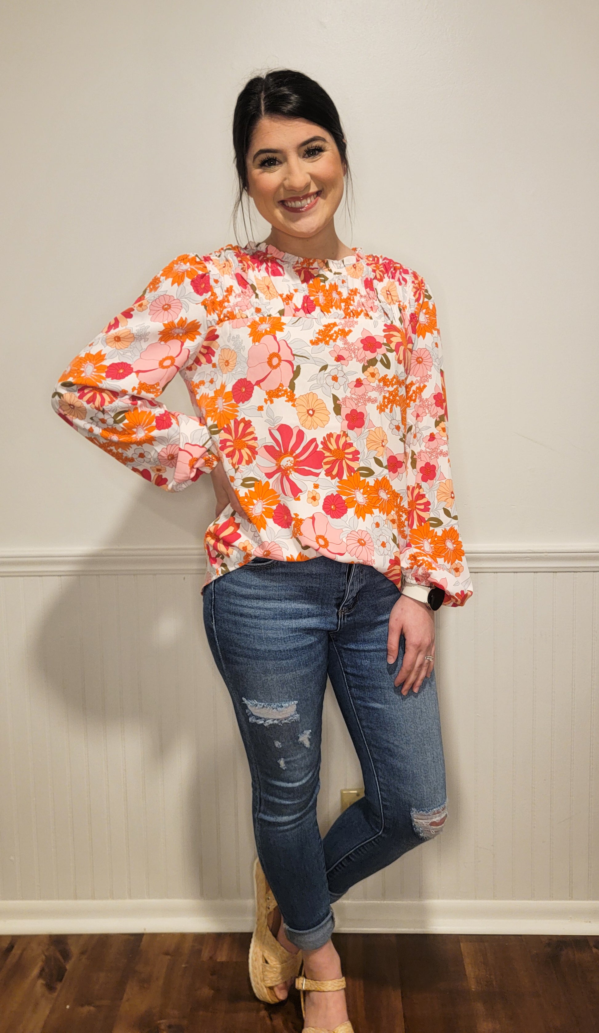 This beautiful floral blouse adds the perfect amount of color to your spring closet! It features a frilled neckline and puff sleeves for the perfect amount of flare. It also has elastic at the wrists and a keyhole at the back with a functional button closure. We have this top paired with our Cello Dark Wash High-Waisted Denim Jeans.