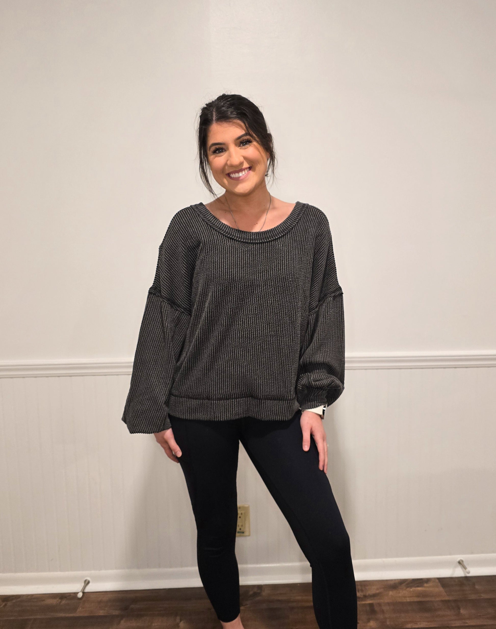 This oversized knit top is so good! It has a round neckline, drop shoulder hemlines, and oversized balloon sleeves. It also features square back neck detailing. Can be super casual when paired with leggings or dressed up with your favorite pair of denim! It is slightly cropped!