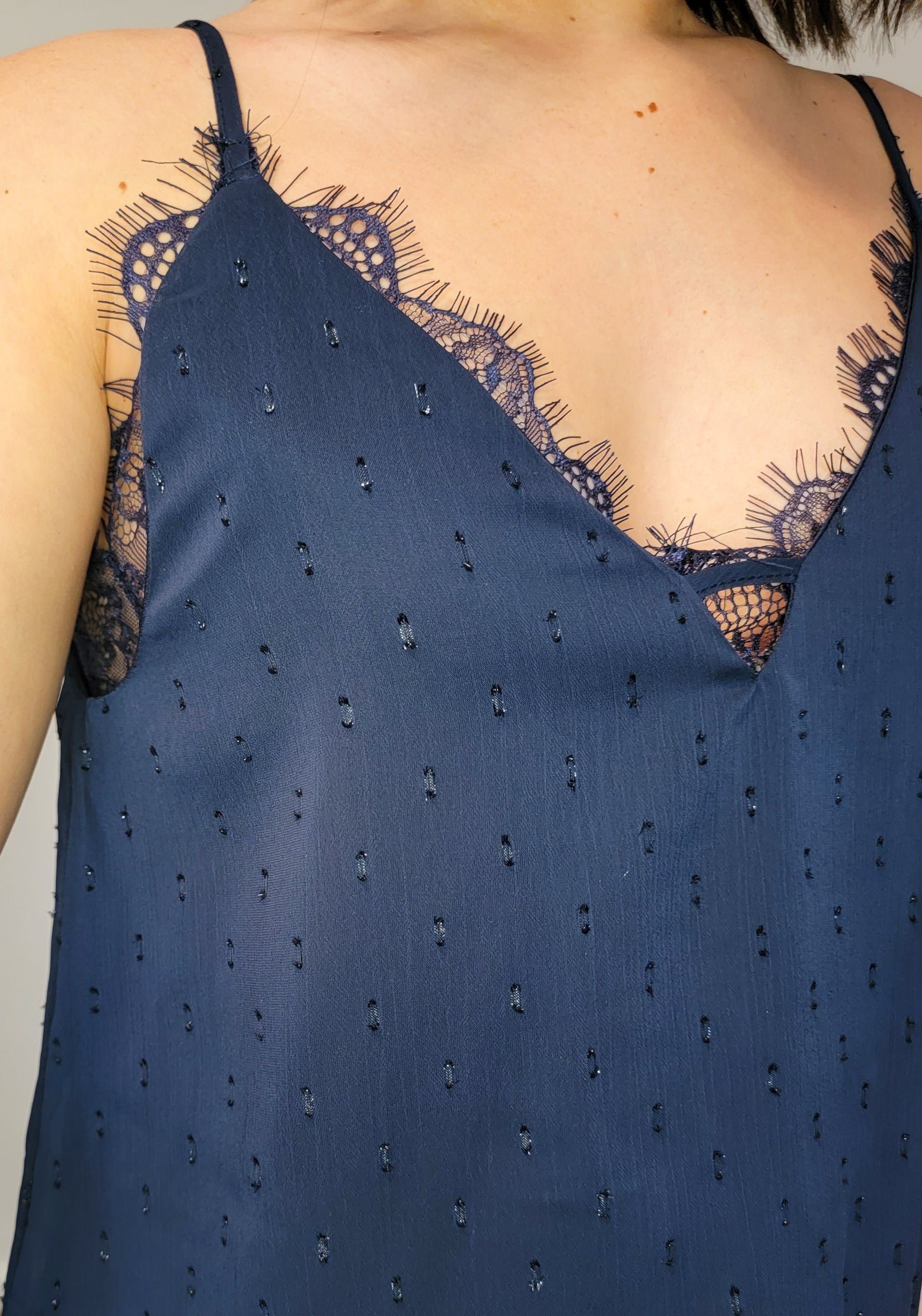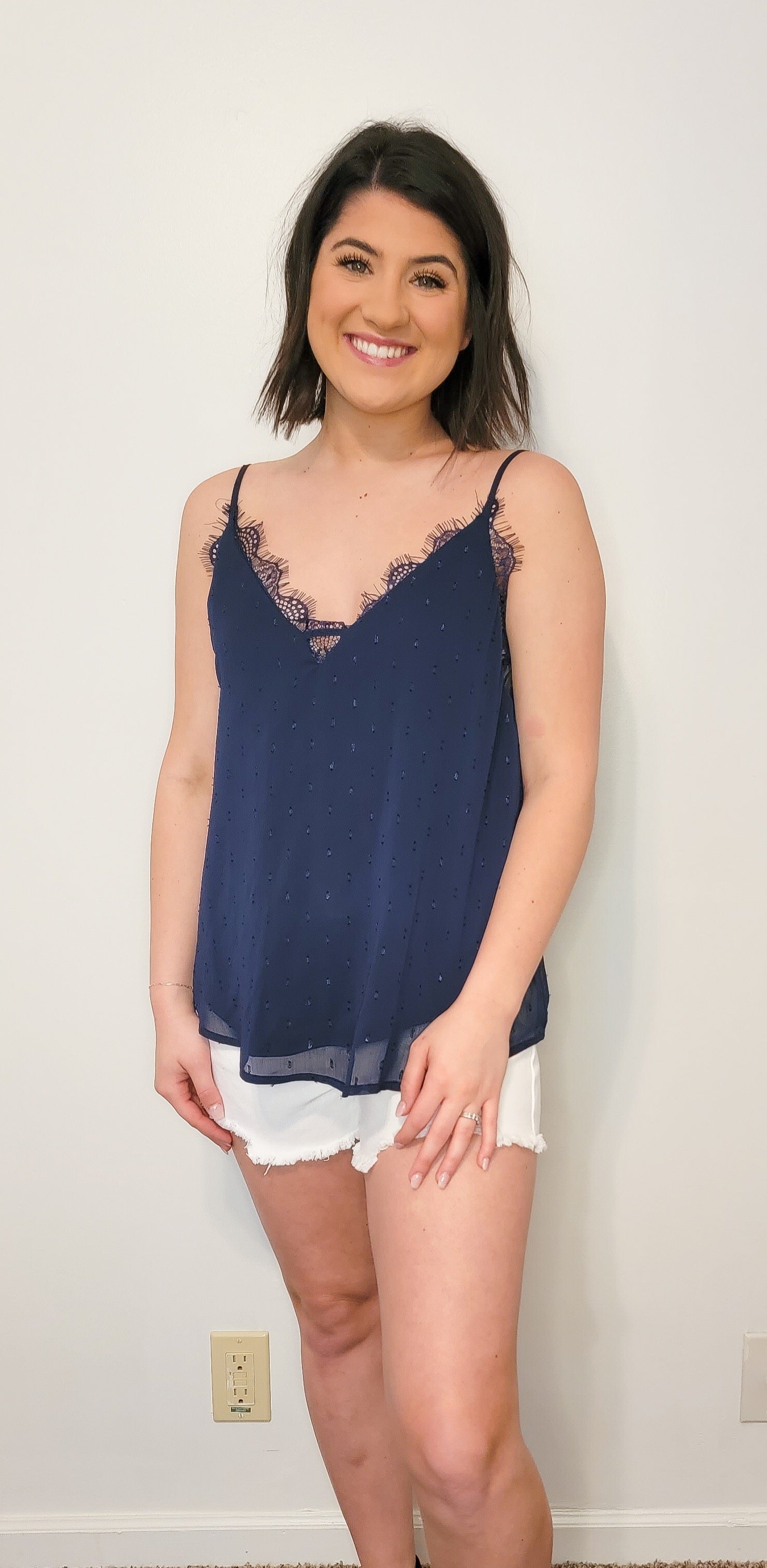 This beautiful cami has the best lace detailing! The perfect v-neckline and swiss dot design add the perfect amount of flare! Great for date night!