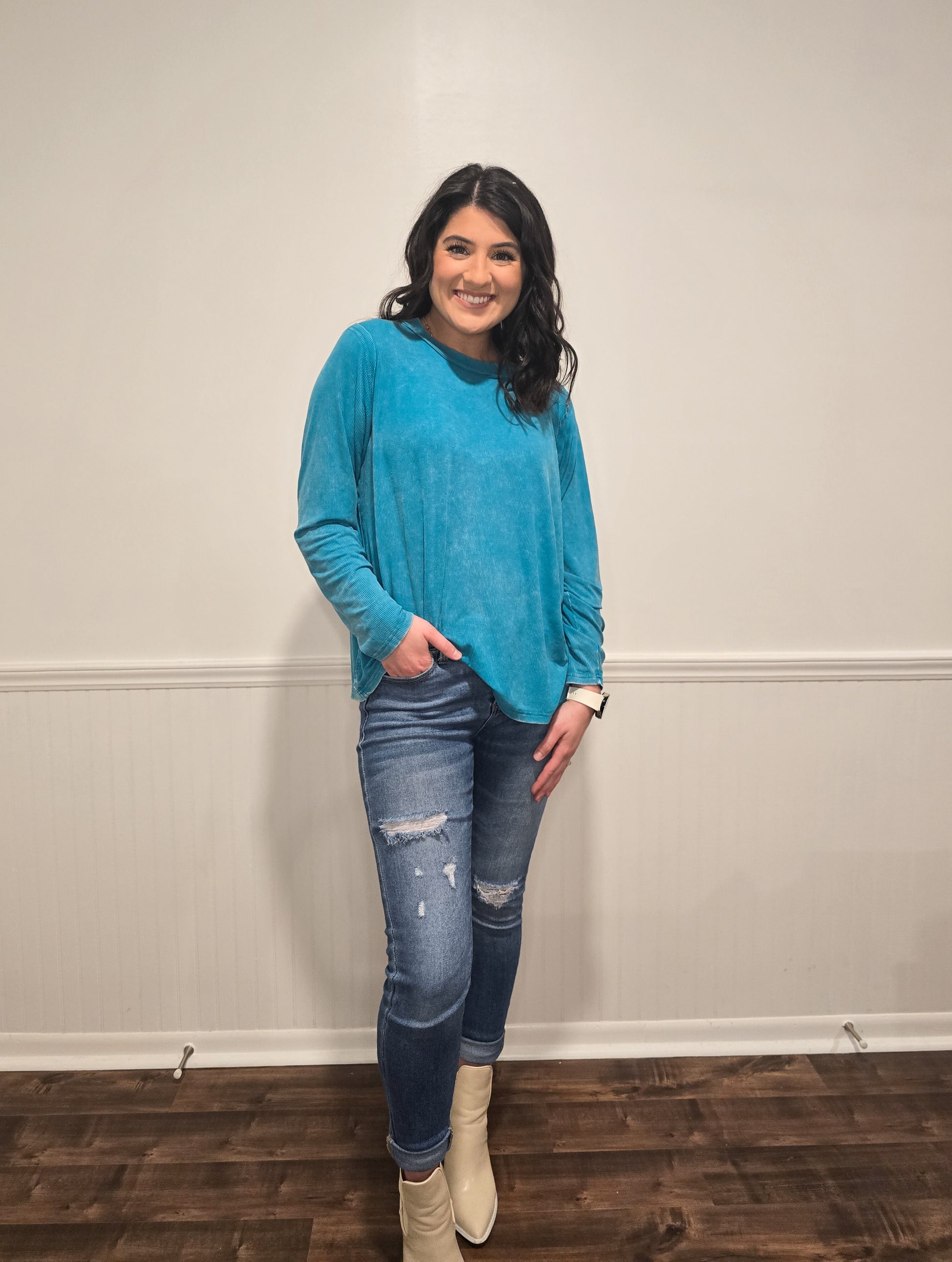 You don't want to miss out on this BUTTERY SOFT long sleeve top! It is lightweight and perfect by itself or under layers!! Featuring a scoop neckline and ribbed detailing, this top is a must have!