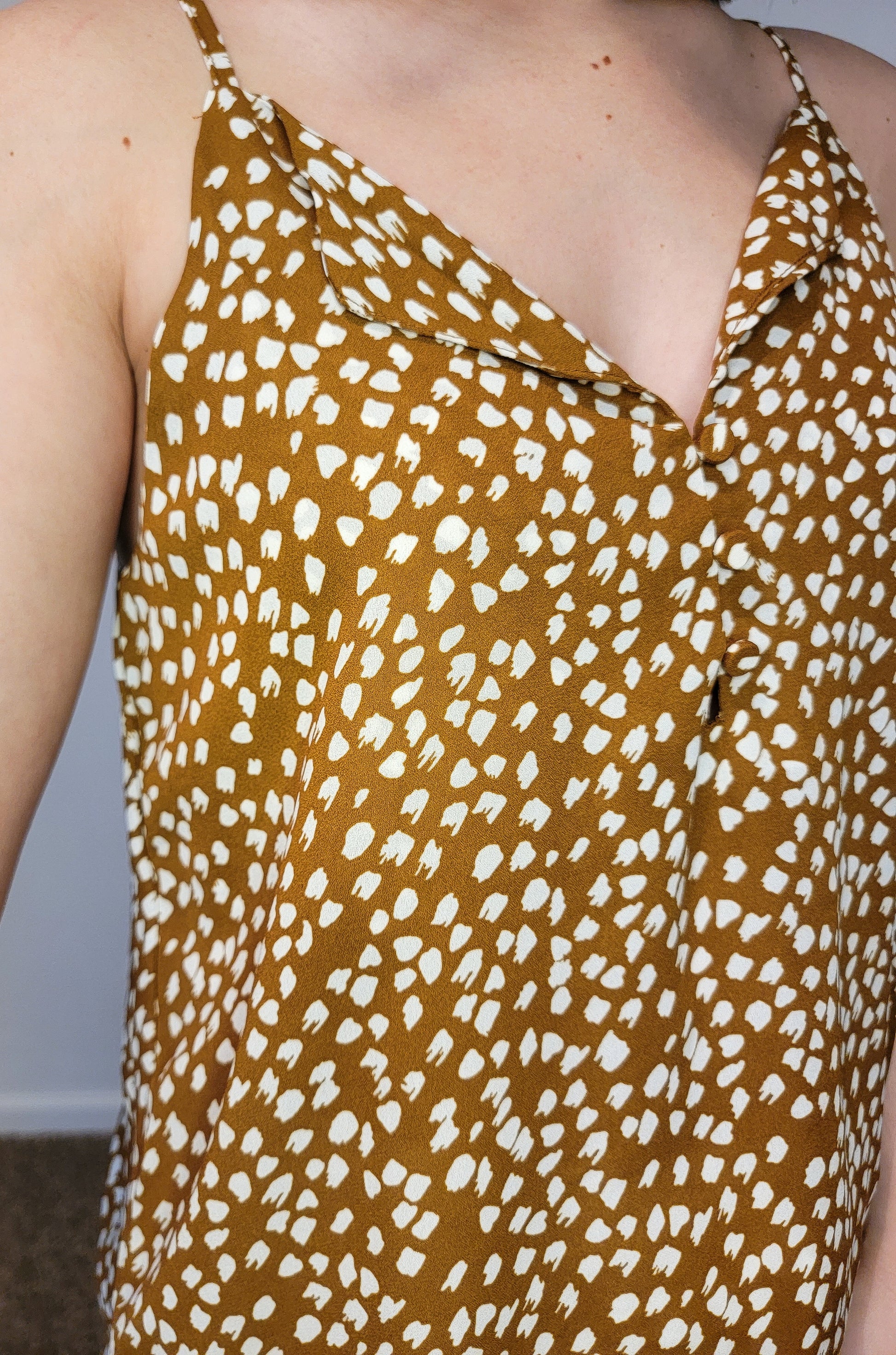 This split neckline cami is perfect for those warm days! It has the best button detailing and speckled pattern for the cutest look! Perfect for date night! We have it paired with our White Denim High Waisted Shorts