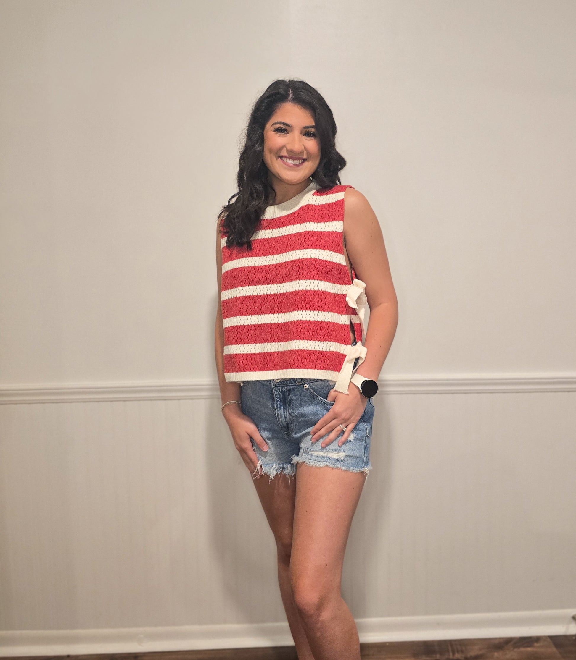 This adorable striped vest top is perfect for summer! It is textured and features side-ties. It is a bit cropped. It is perfect for over your bathing suit or by itself with a pair of your favorite shorts!