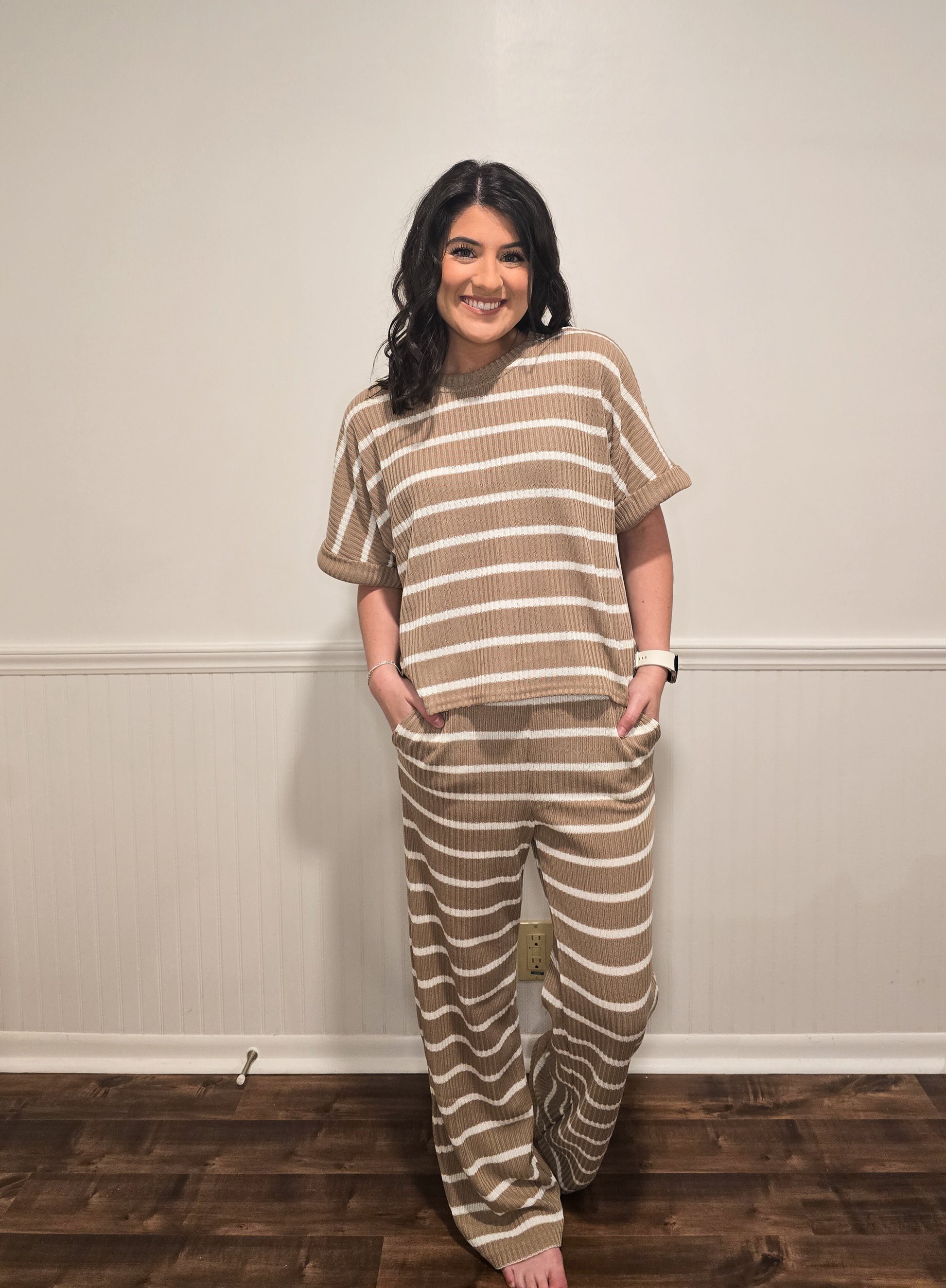 This absolutely precious lounge pants set is some amazing!!! The top has a boxy, oversized fit and short folded sleeves along with a round neckline. The pants have an elastic waistline and POCKETS!