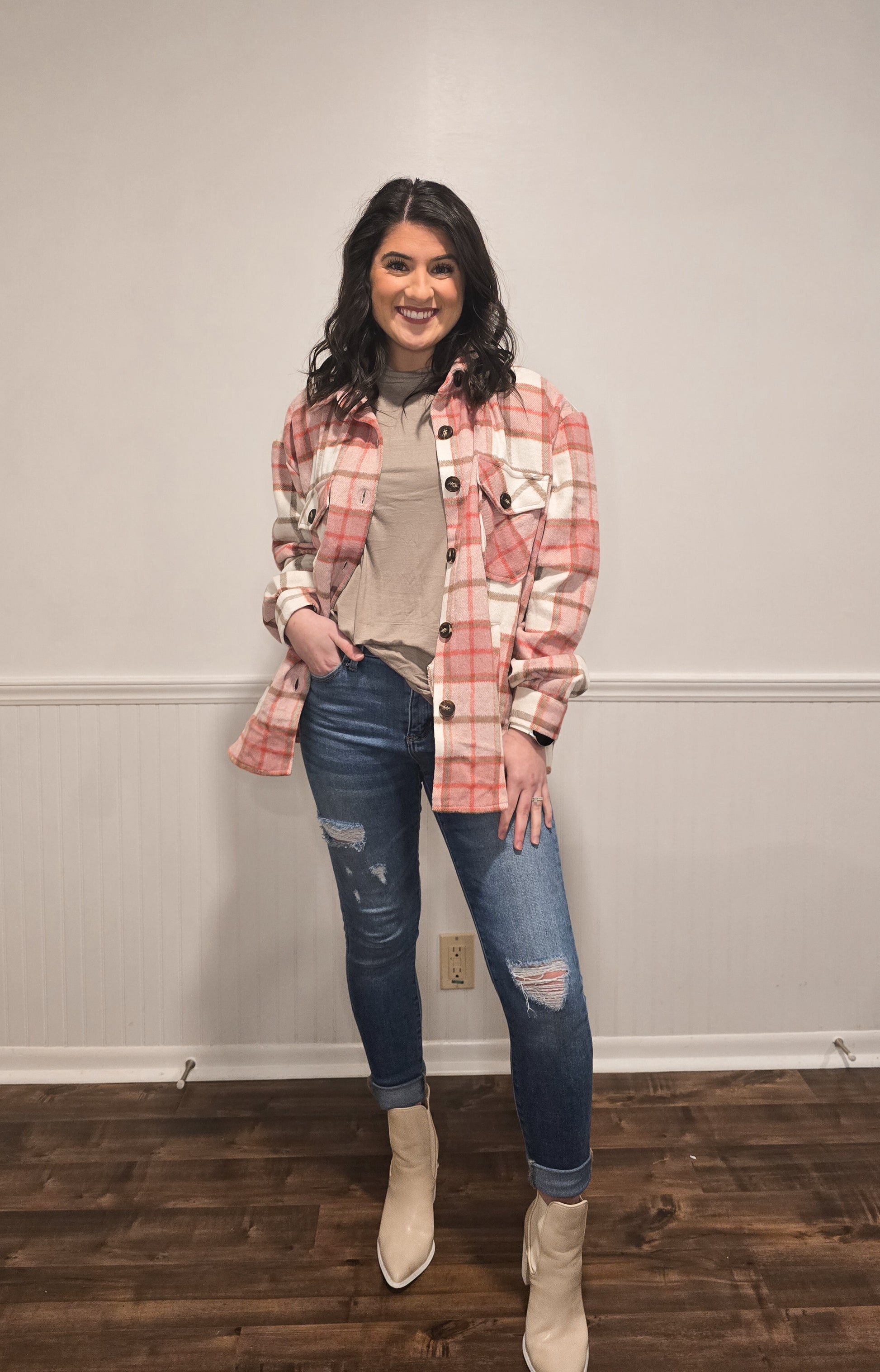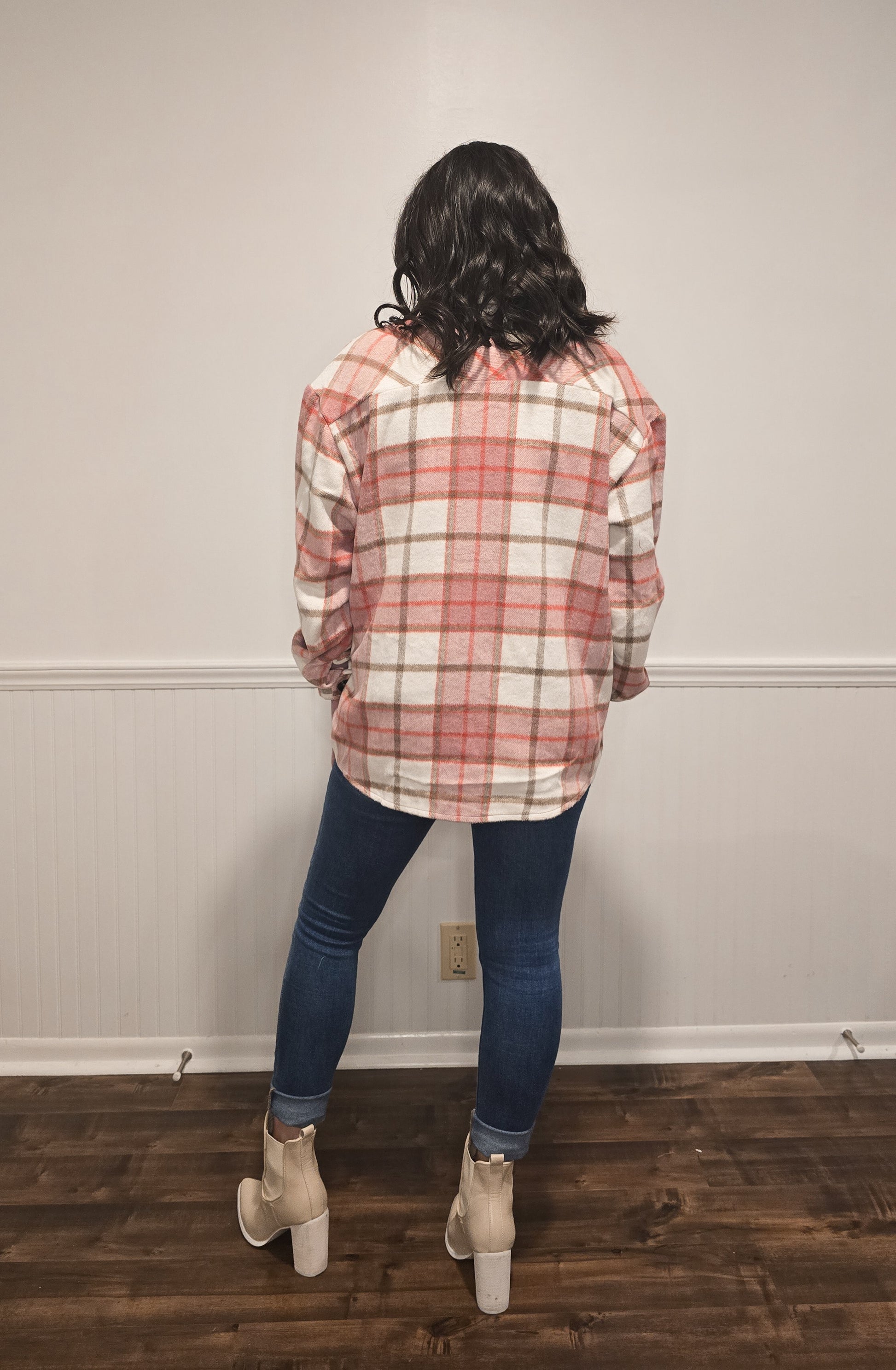 Get ready for chilly weather with the perfect addition to your outfit! This jacket features thick and warm material patterned with a pink, khaki and white plaid print, a button down front with a collared neckline, long sleeves with button closure cuffs, two accent pockets, and a relaxed silhouette.