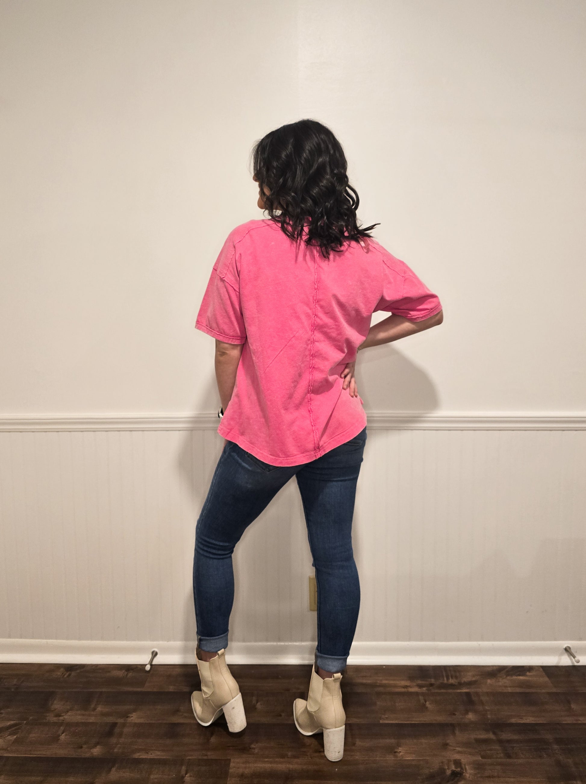 Easily paired with your favorite denim or a comfy pair of leggings, this tee is perfect for all the things! It has exposed raw seams and a chest patch pocket. It features drop shoulder seams and a casual, loose fit. Rounded Hemline.