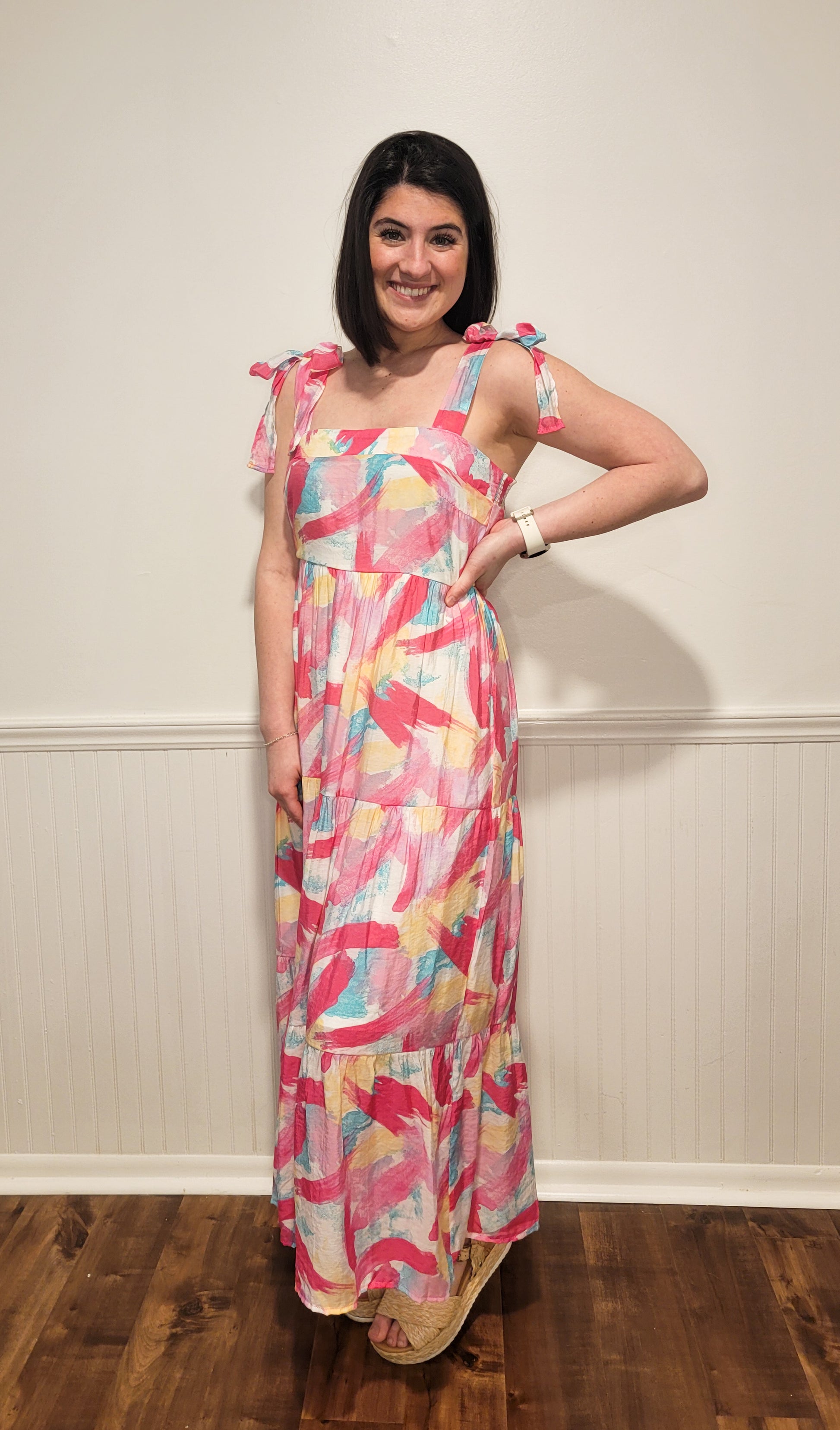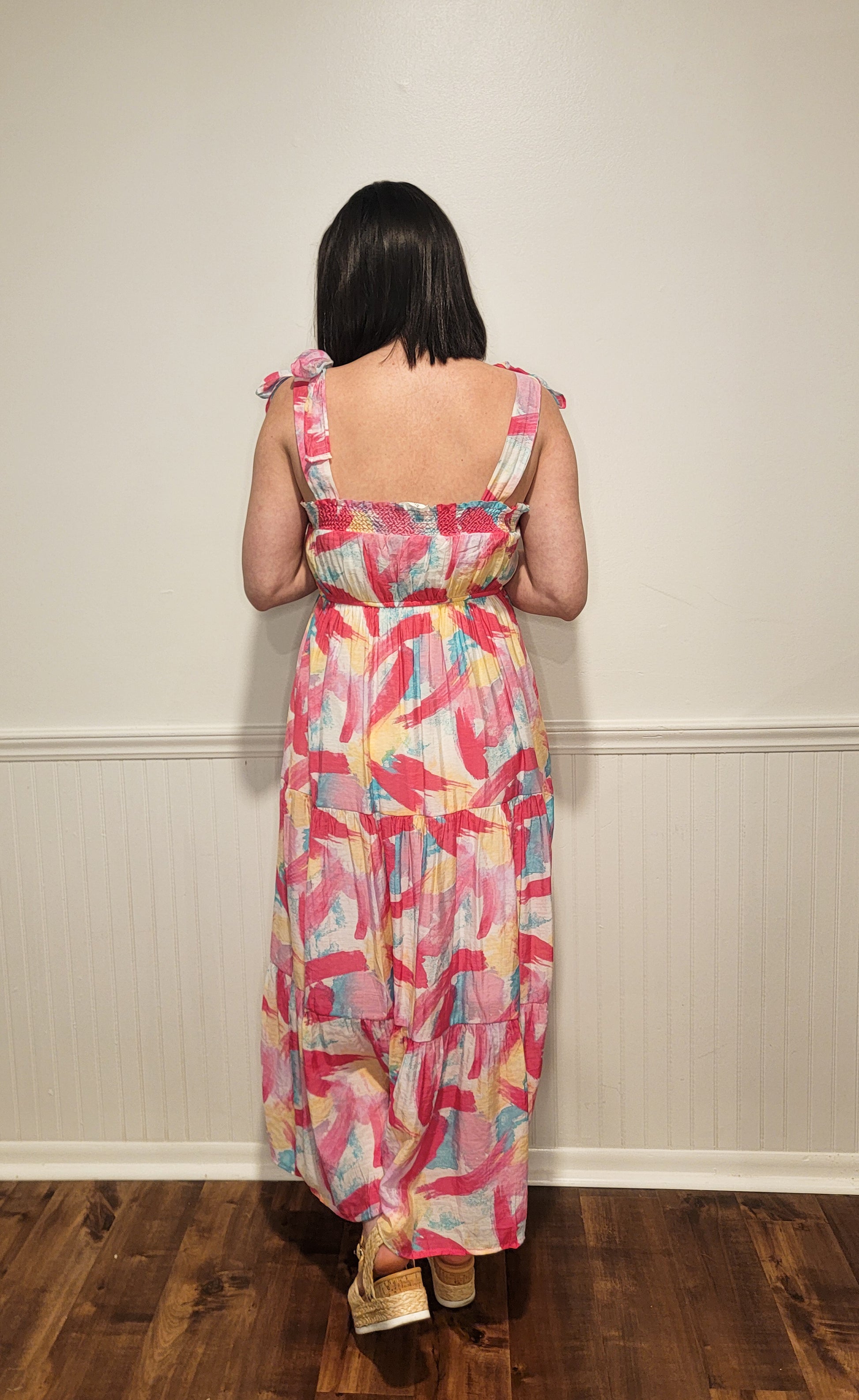 This adorable brush stroke midi dress is so classy and perfect for so many different occasions! It features a square neckline and back opening with non-functional tie straps. It also has an elasticized back to allow for a more comfortable and flattering fit! The skirt is tiered and adds the perfect amount of flare to the dress! Light weight.