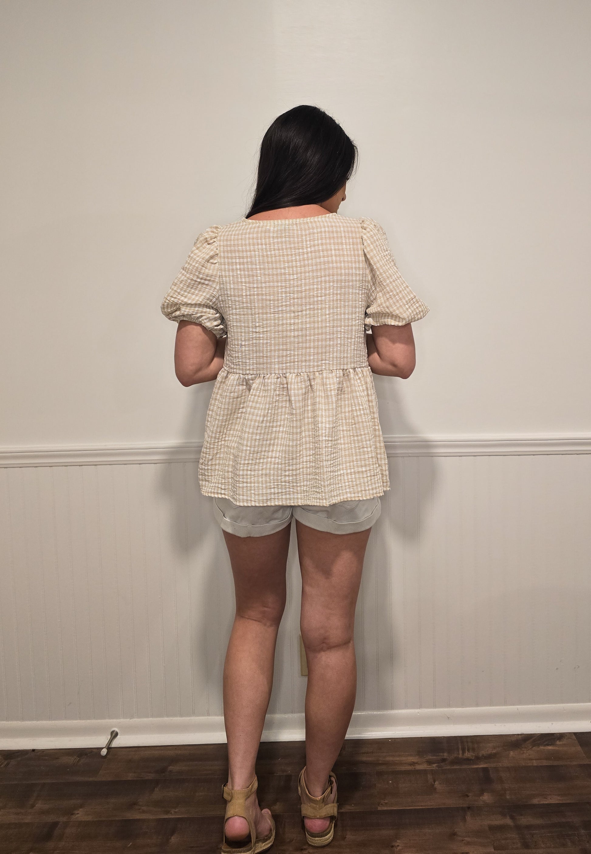 This adorable textured gingham top has puff bubble sleeves with elastic at the opening and a v-neckline. It also features 2 buttons at the front, with the top button being functional. It is lightweight and and has shirring detailing at the bust, shoulders and waistline.