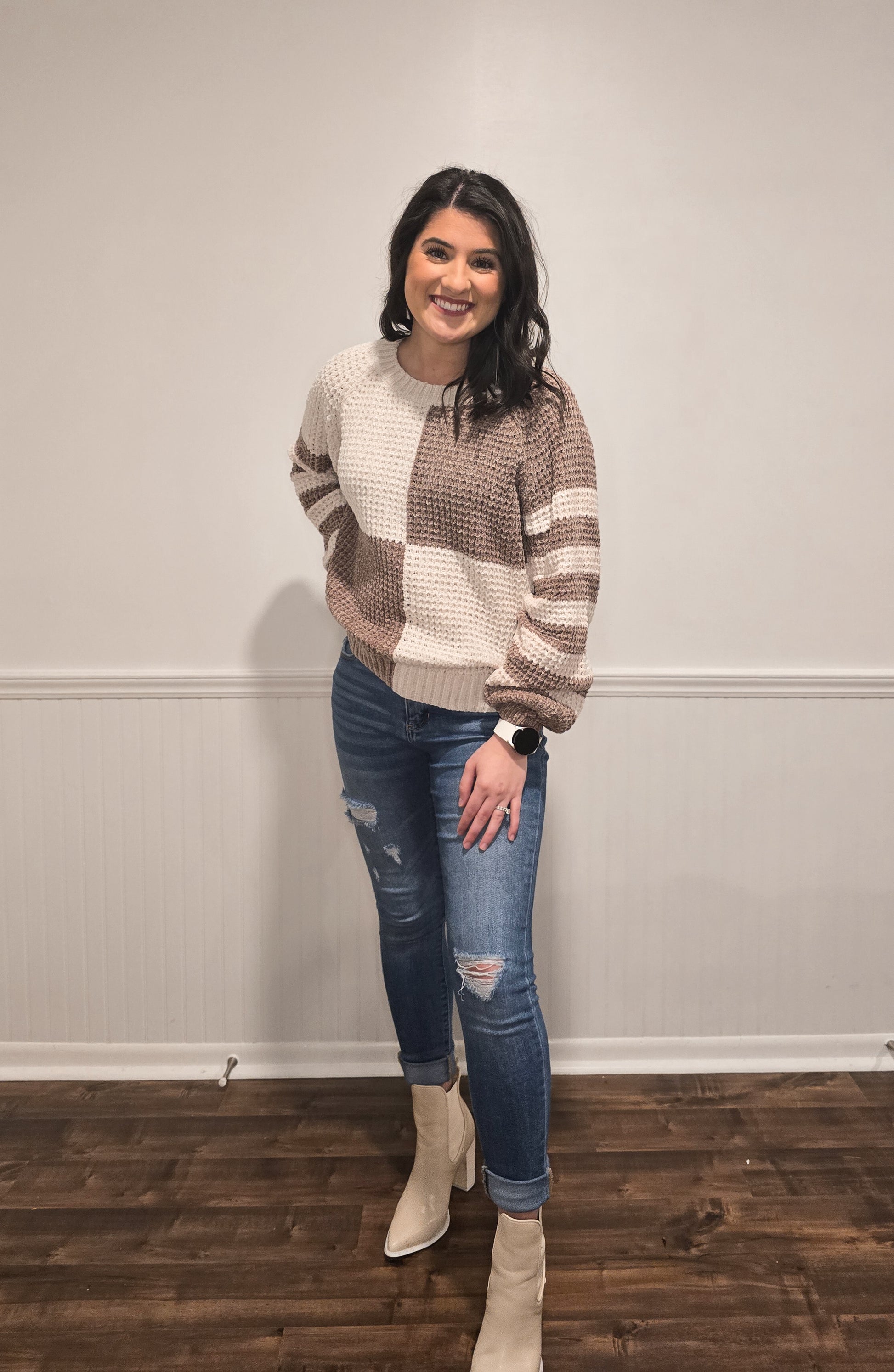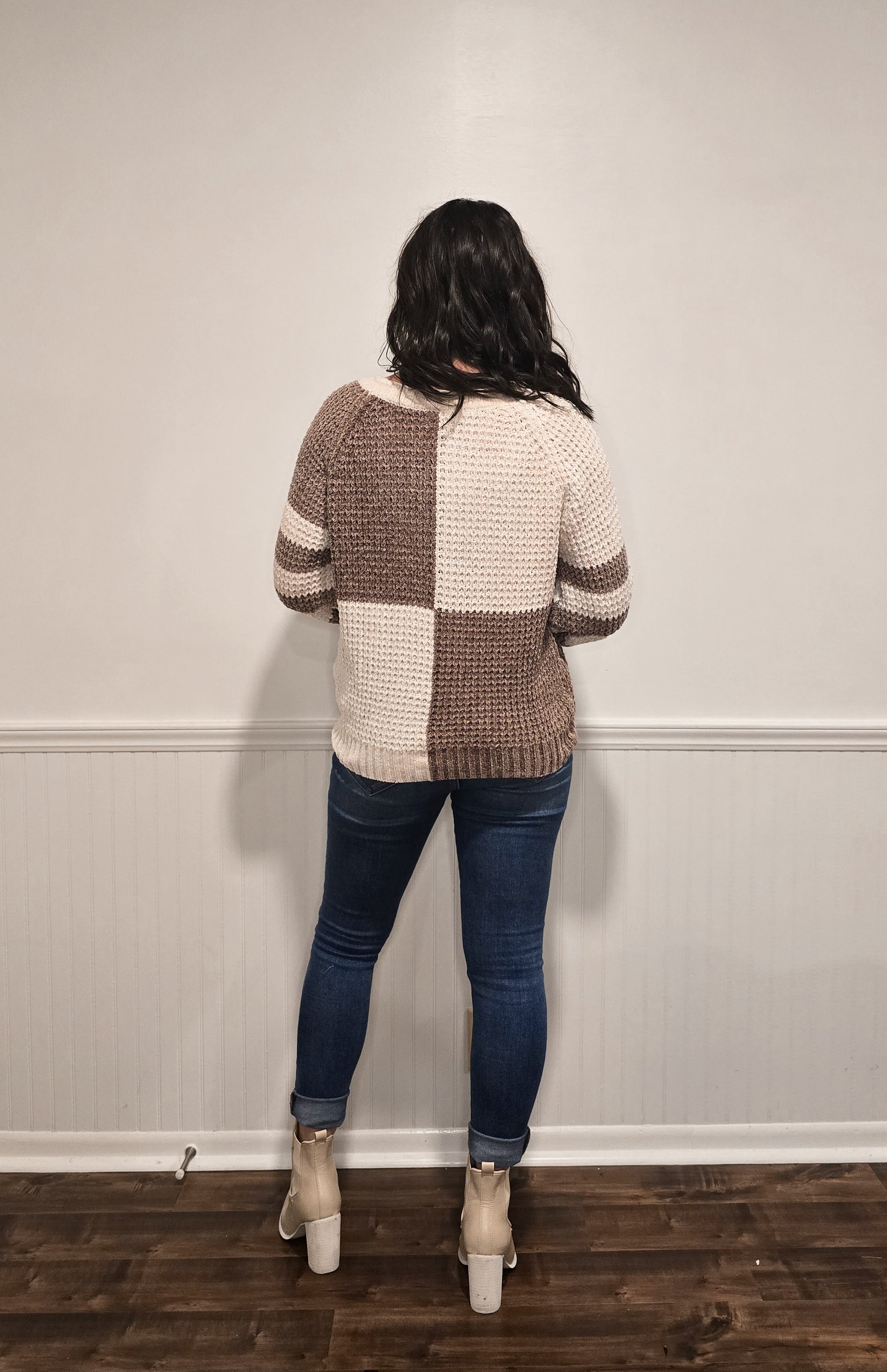 This incredibly cozy sweater is made with the best chenille knit material! Perfect for those chilly fall days. It has a colorblock pattern and striped sleeves. You don't want to miss out on this super soft sweater for this fall and winter!