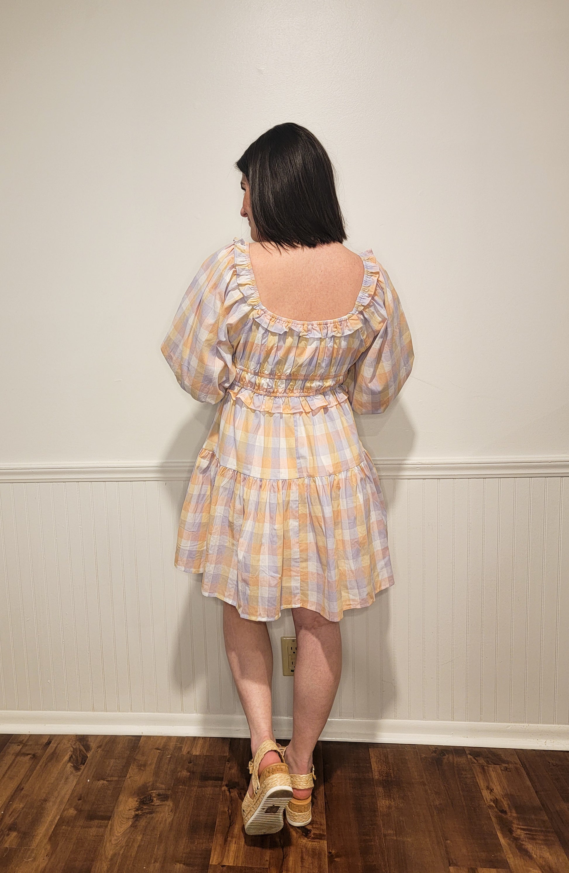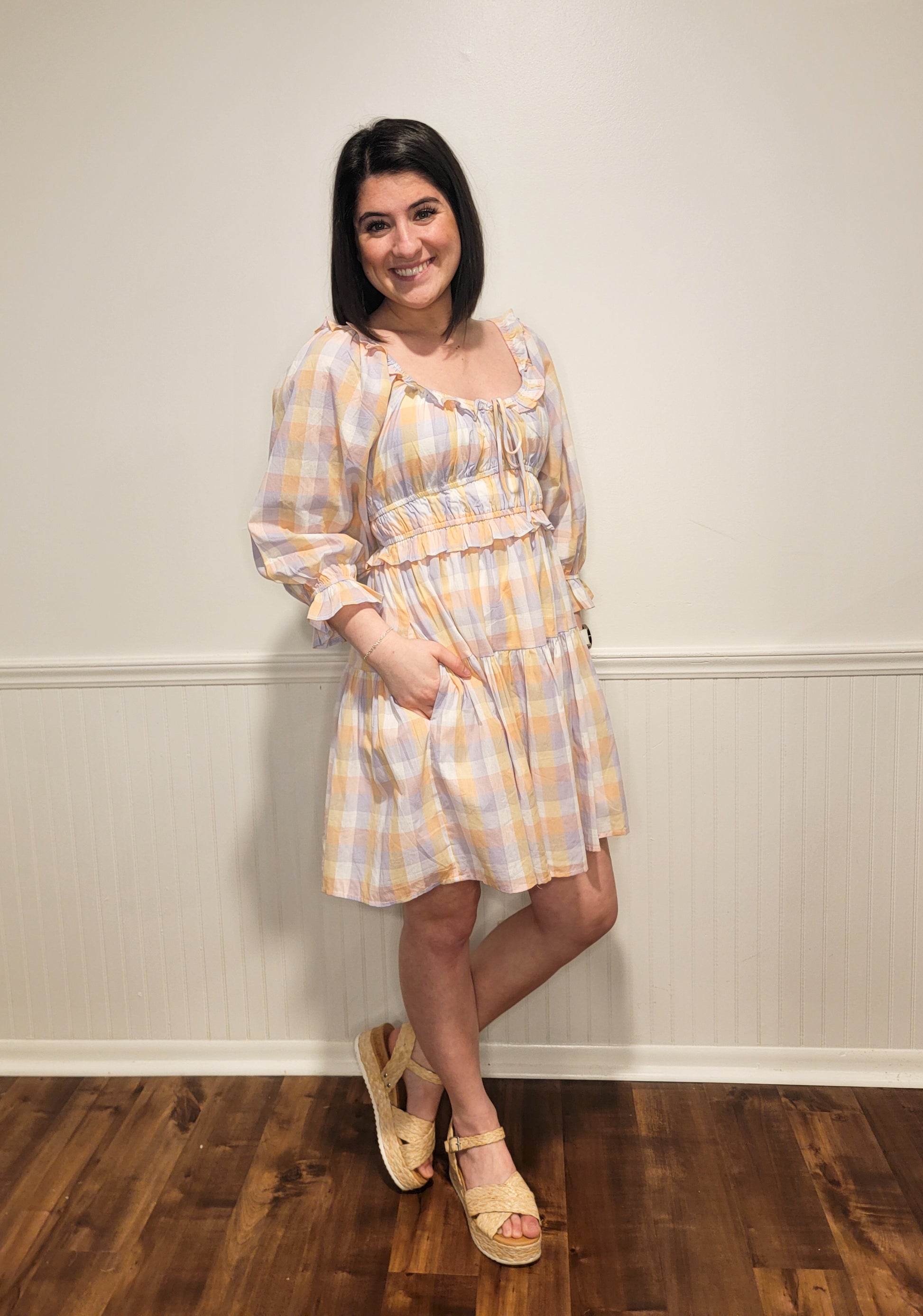 This GORGEOUS puff sleeve mini dress is A MUST for your closet!! Featuring a scoop neckline, smocked detailing at the bust and elastic at the waist, this dress is SO FLATTERING! It also features a self tie closure at bust. The best part……POCKETS!!!!