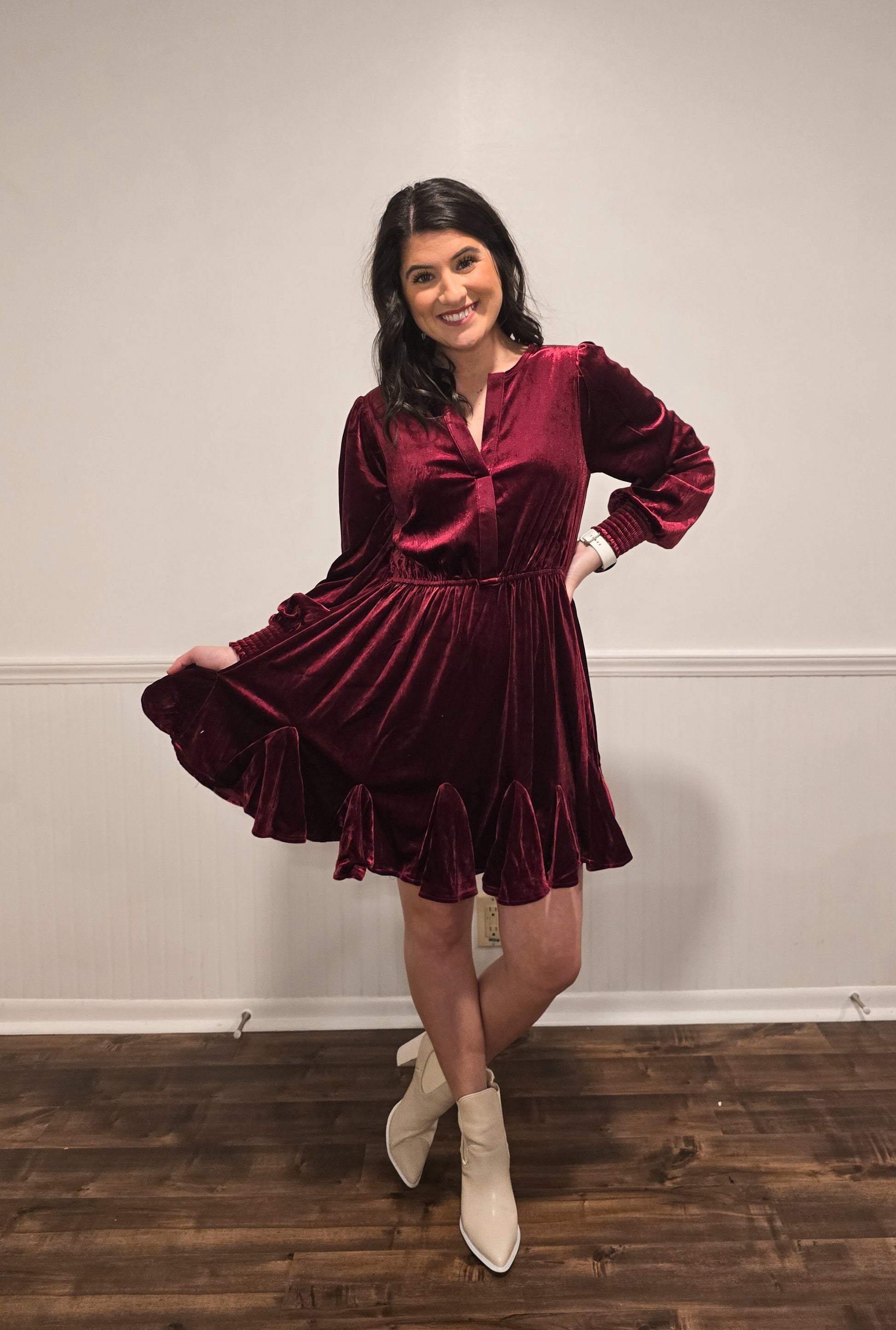This velvet dress is perfect for the holidays! It features a split neckline and long sleeves with cinching at the wrists. It has an elastic waistline and Godet skirt. Not lined.