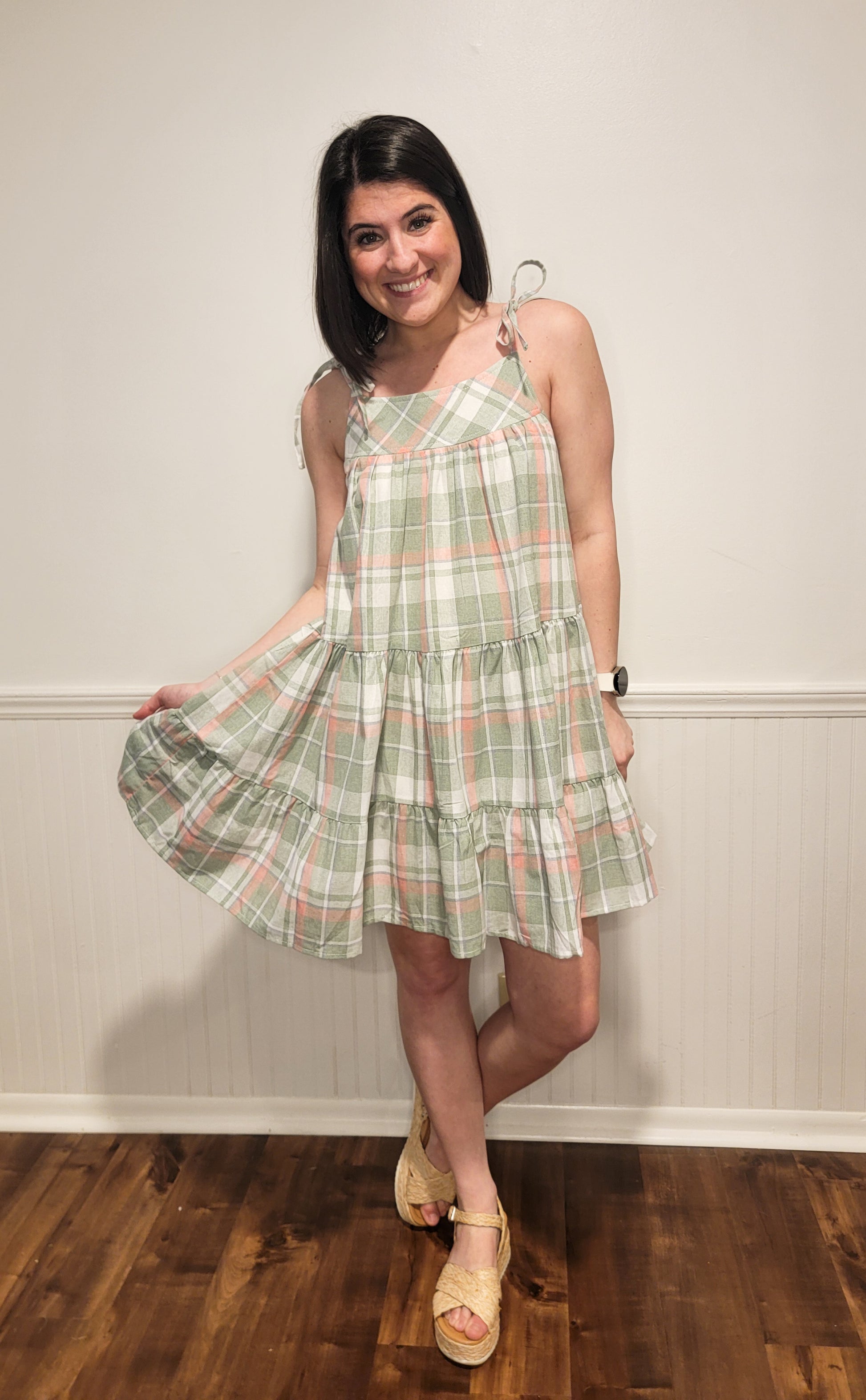 This sweet plaid dress features self tie closure at the straps for an adjustable fit! It has a square neckline and has a tiered silhouette.
