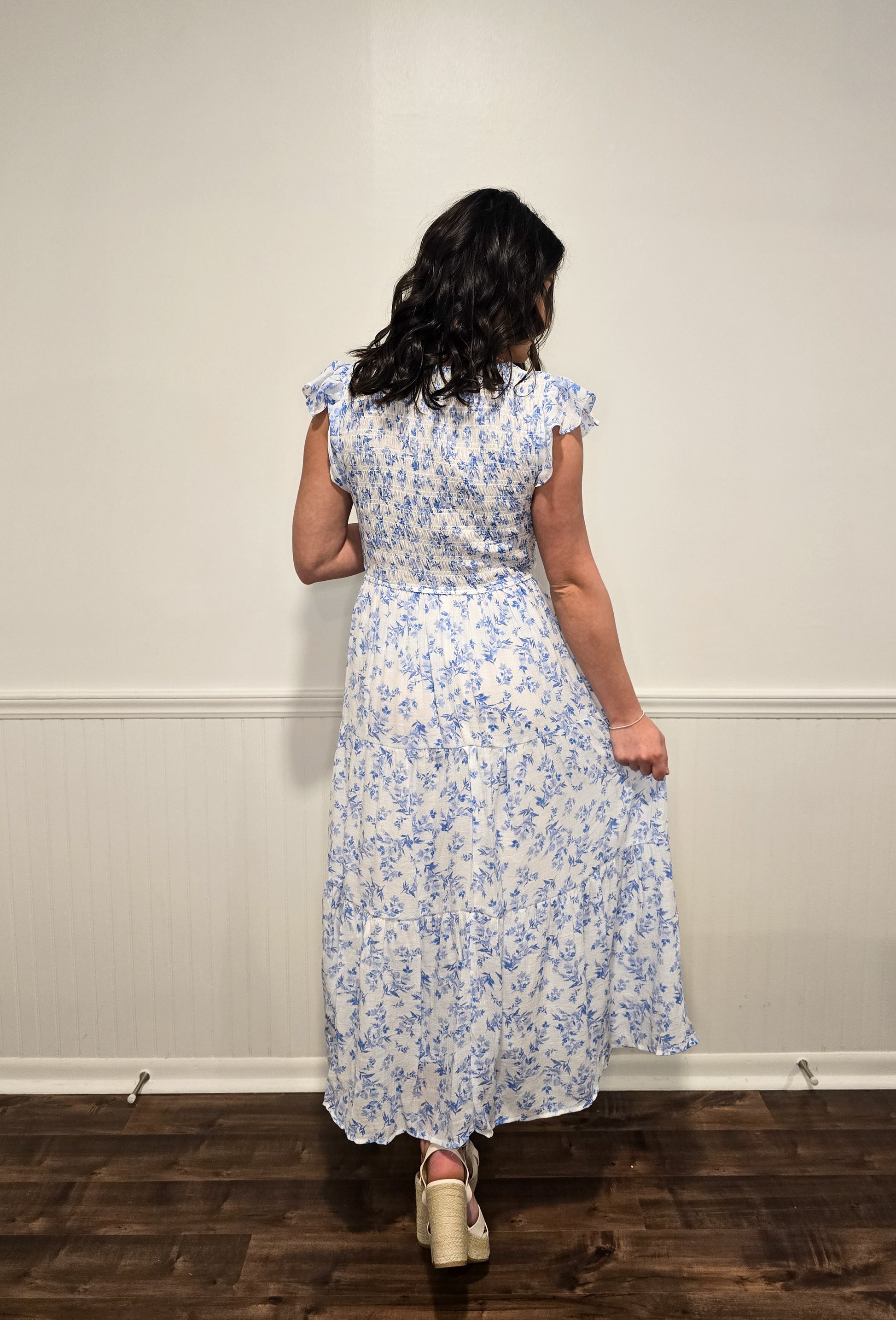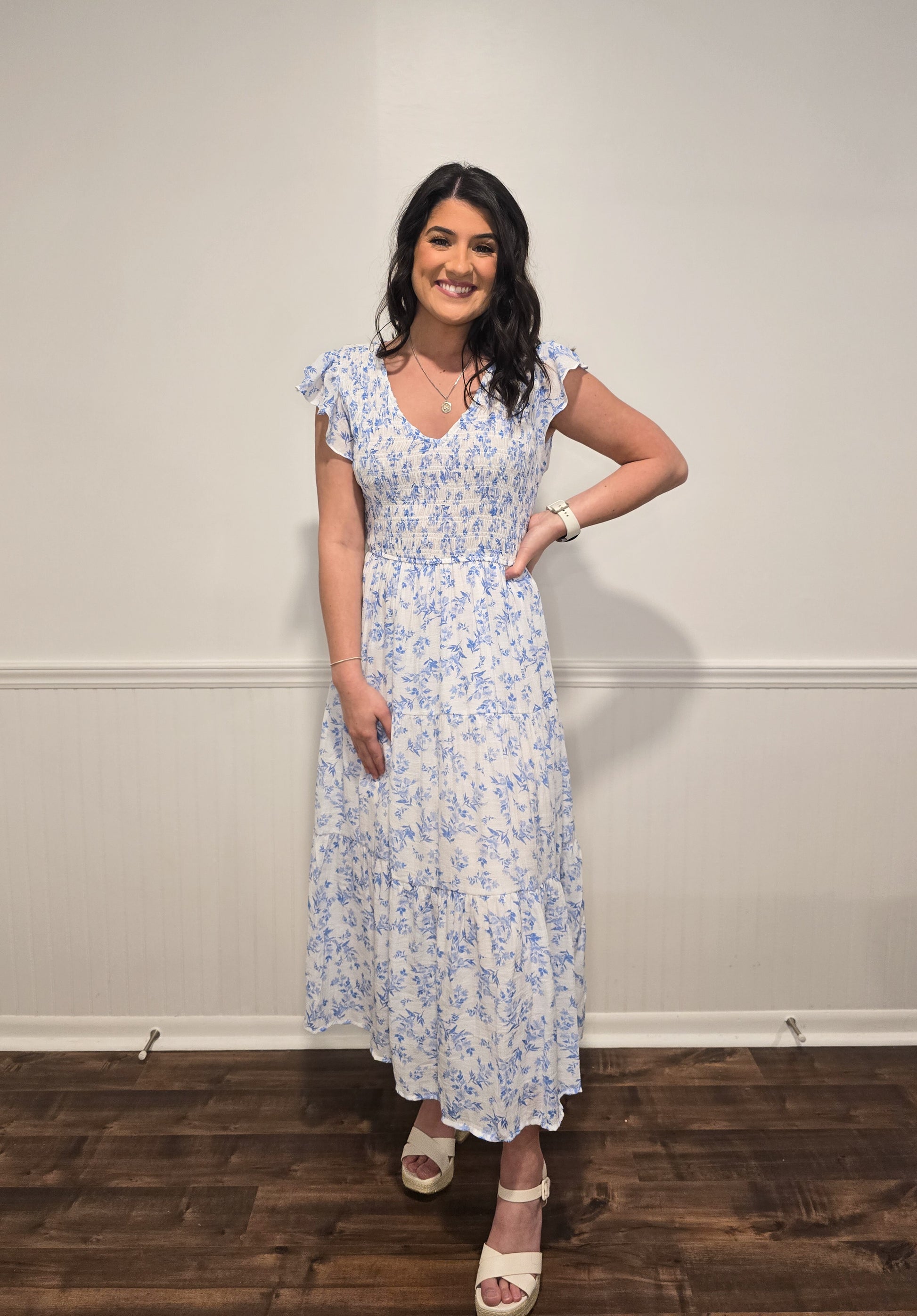This adorable floral midi dress is perfect for so many occasions! Featuring a v-neckline, short flutter cap sleeves and a smocked bodice, this dress is so flattering! It has tiered detailing and an A-line silhouette. It is lined.