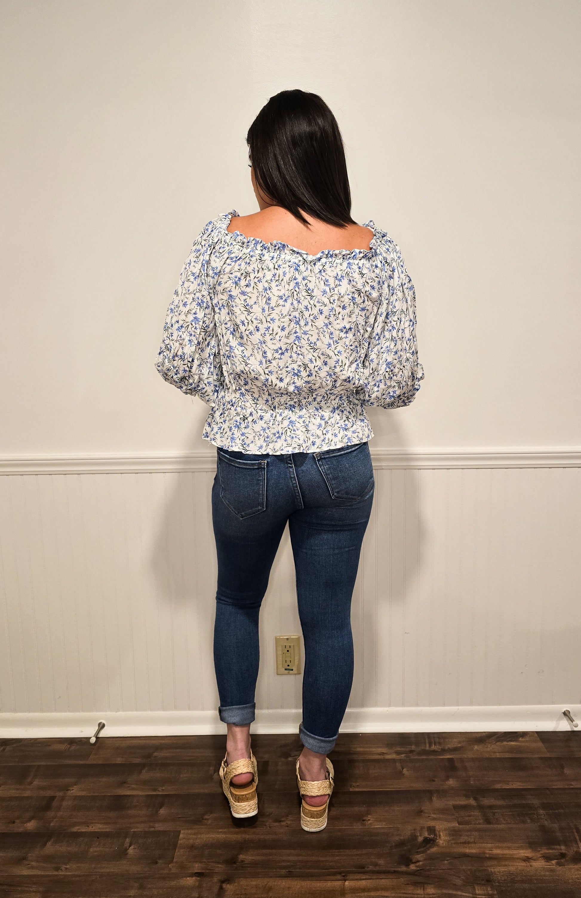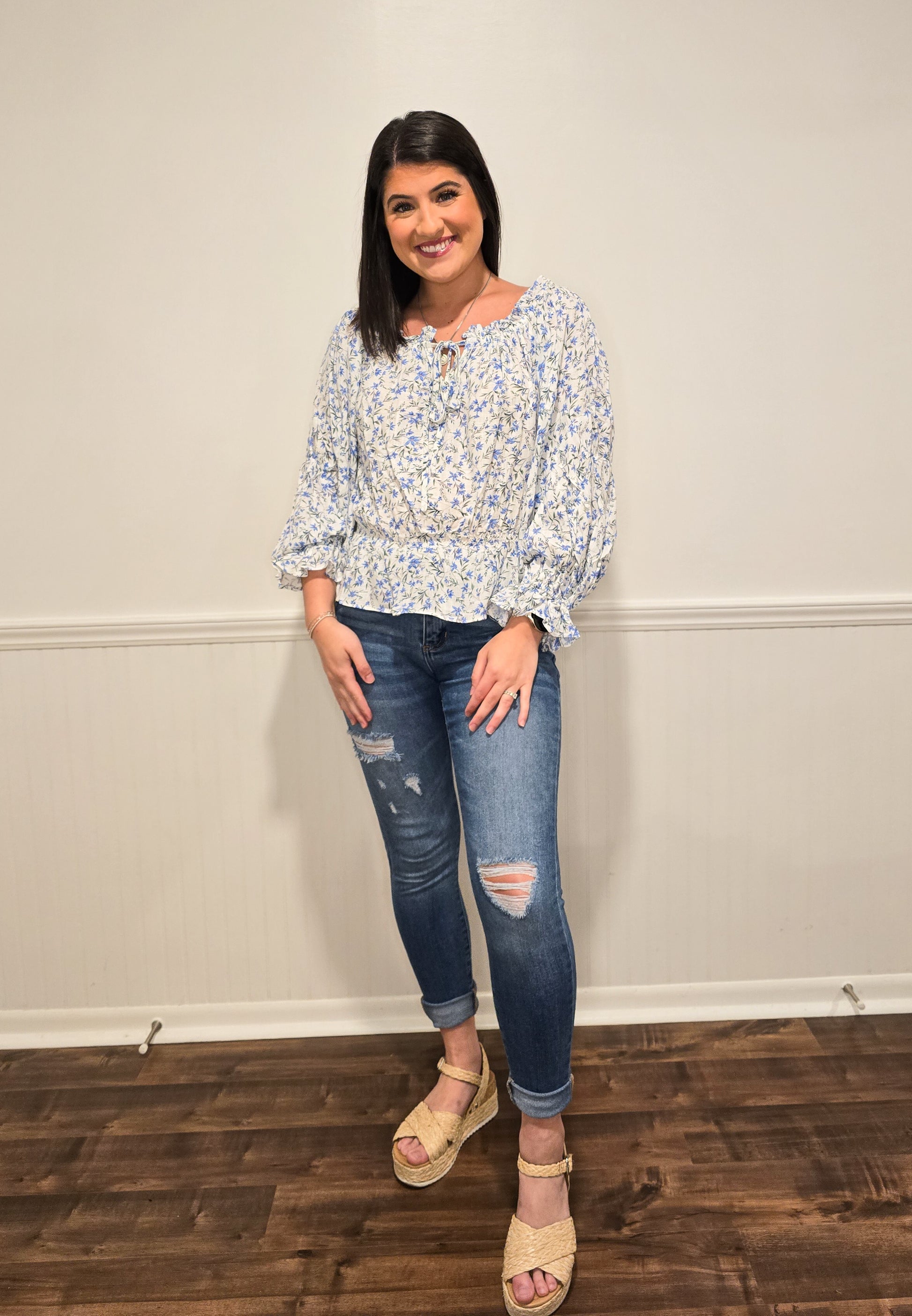 How can you not LOVE this blouse?? It is the cutest floral print and style! It features a front tie and long balloon sleeves with elastic at the waist and wrists. Perfect for date night!
