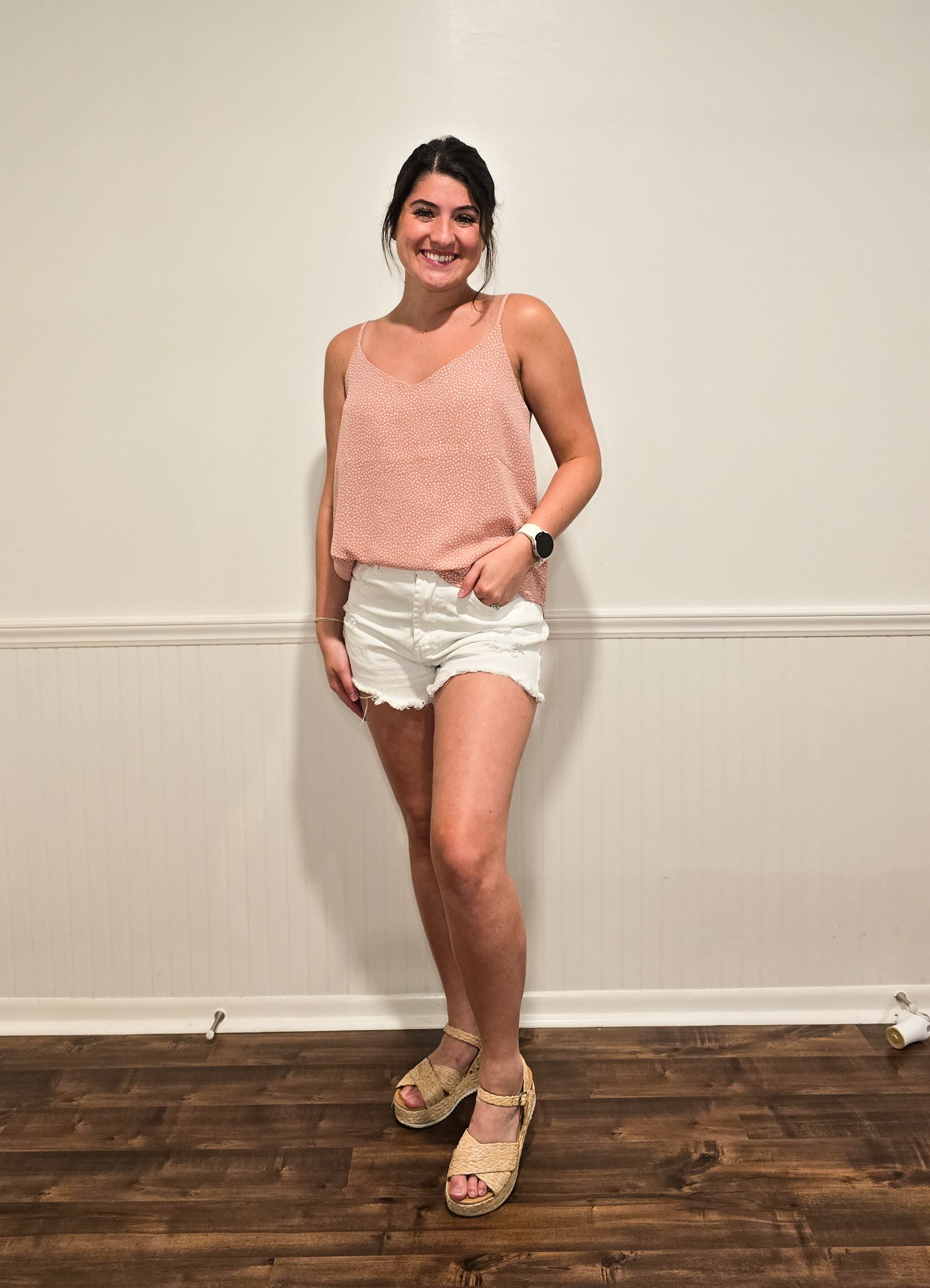 This lightweight cami is perfect for these HOT summer days! It has adjustable spaghetti straps and an adorable speckle dot pattern. You can pair these with your favorite shorts for in the sun or dress it up with your favorite pair of denim pants for the perfect dinner outfit!
