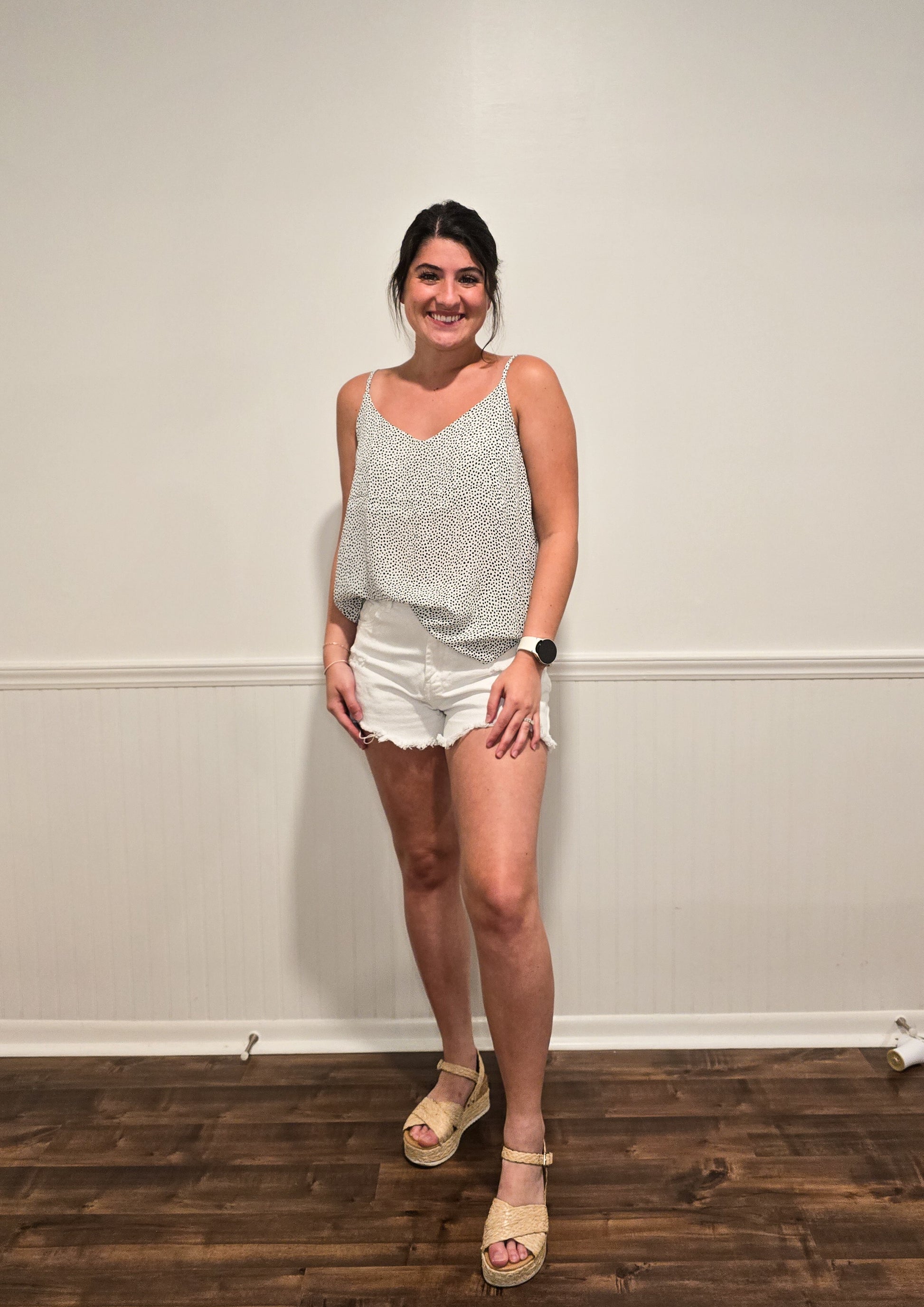 This lightweight cami is perfect for these HOT summer days! It has adjustable spaghetti straps and an adorable speckle dot pattern. You can pair these with your favorite shorts for in the sun or dress it up with your favorite pair of denim pants for the perfect dinner outfit!