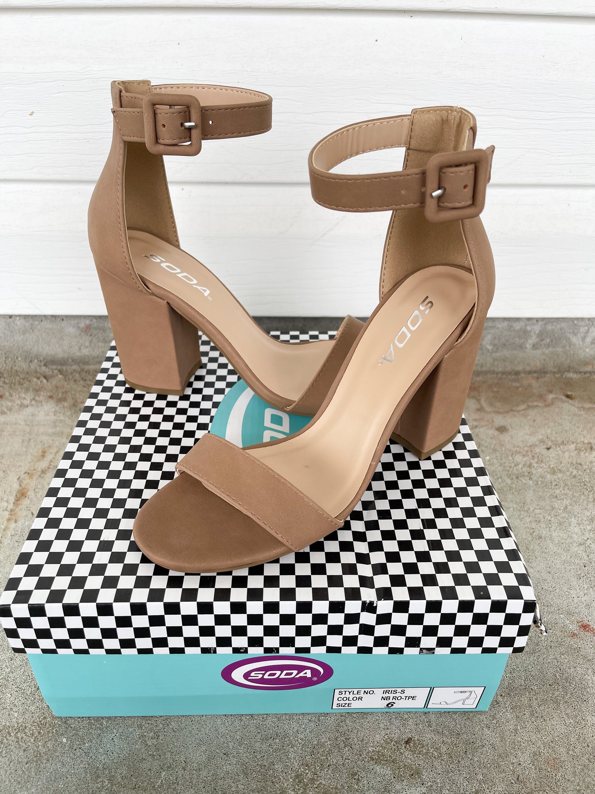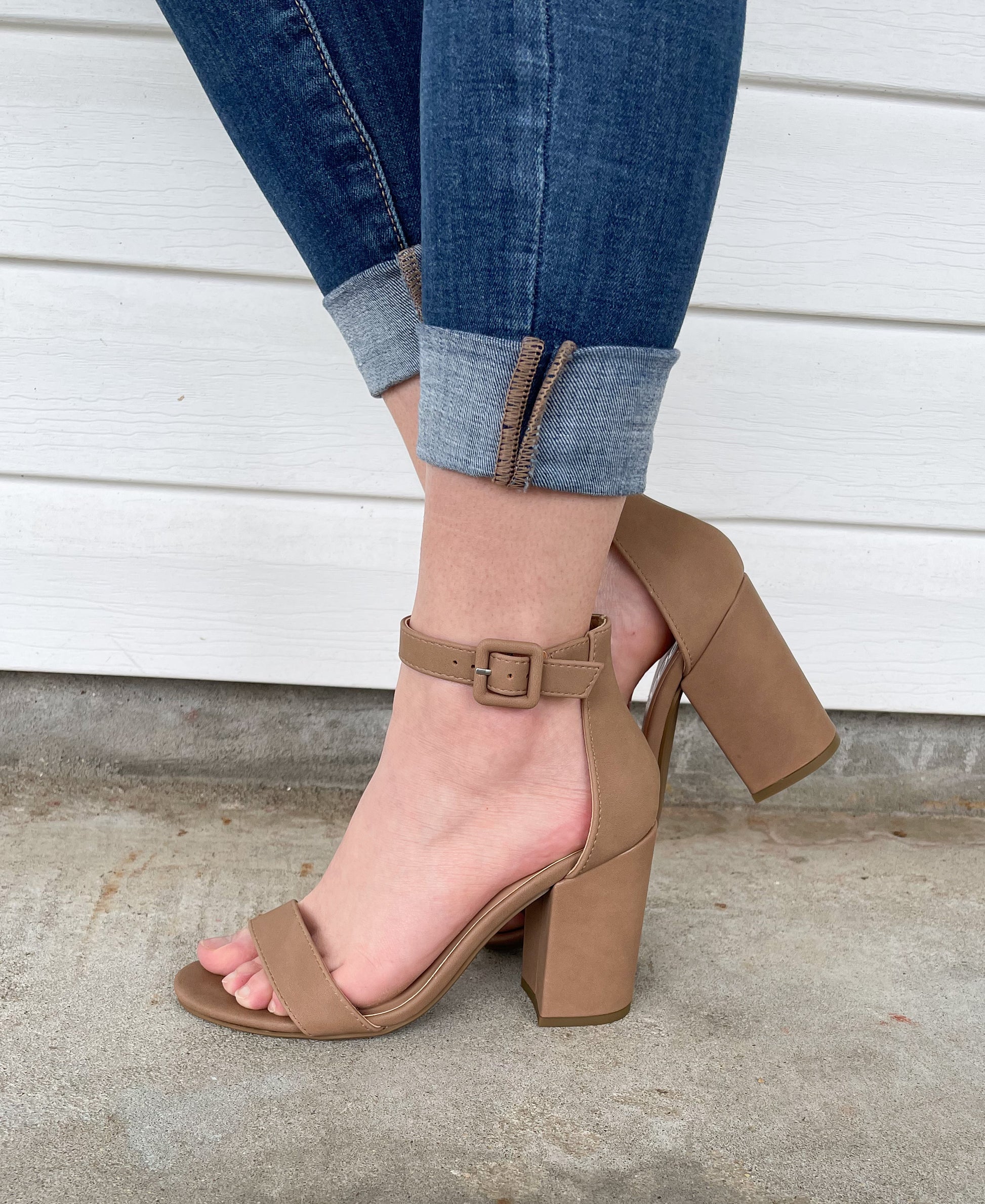 These gorgeous taupe heels have a slight rose undertone! With a cute buckle ankle-strap and chunky heel, these will dress up any outfit!