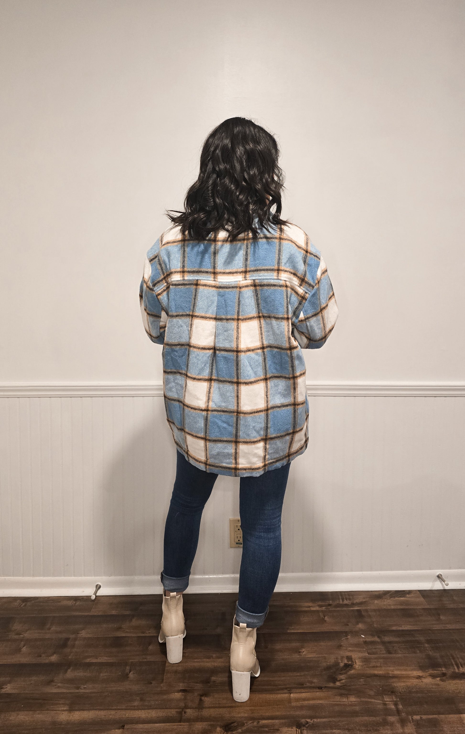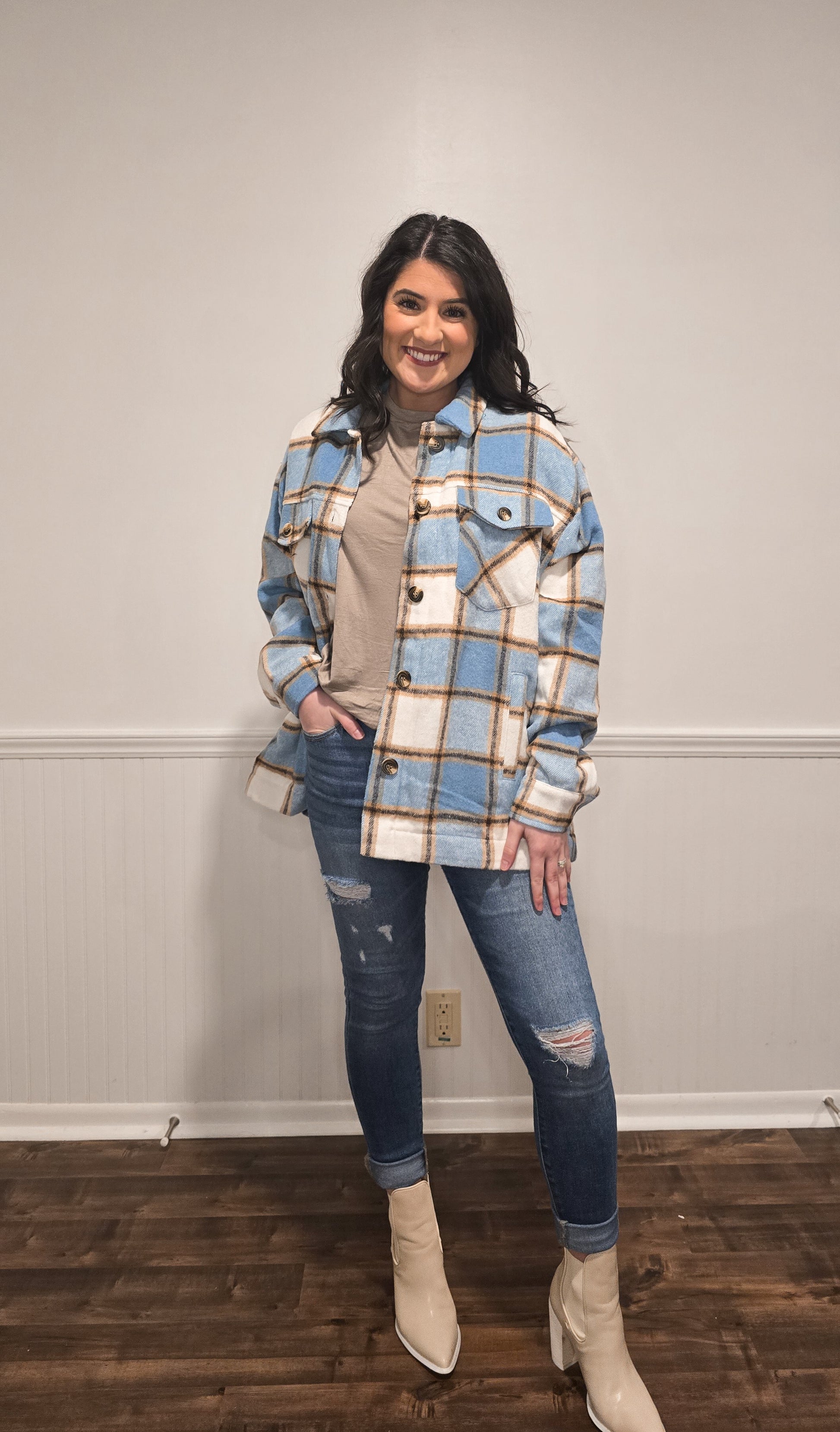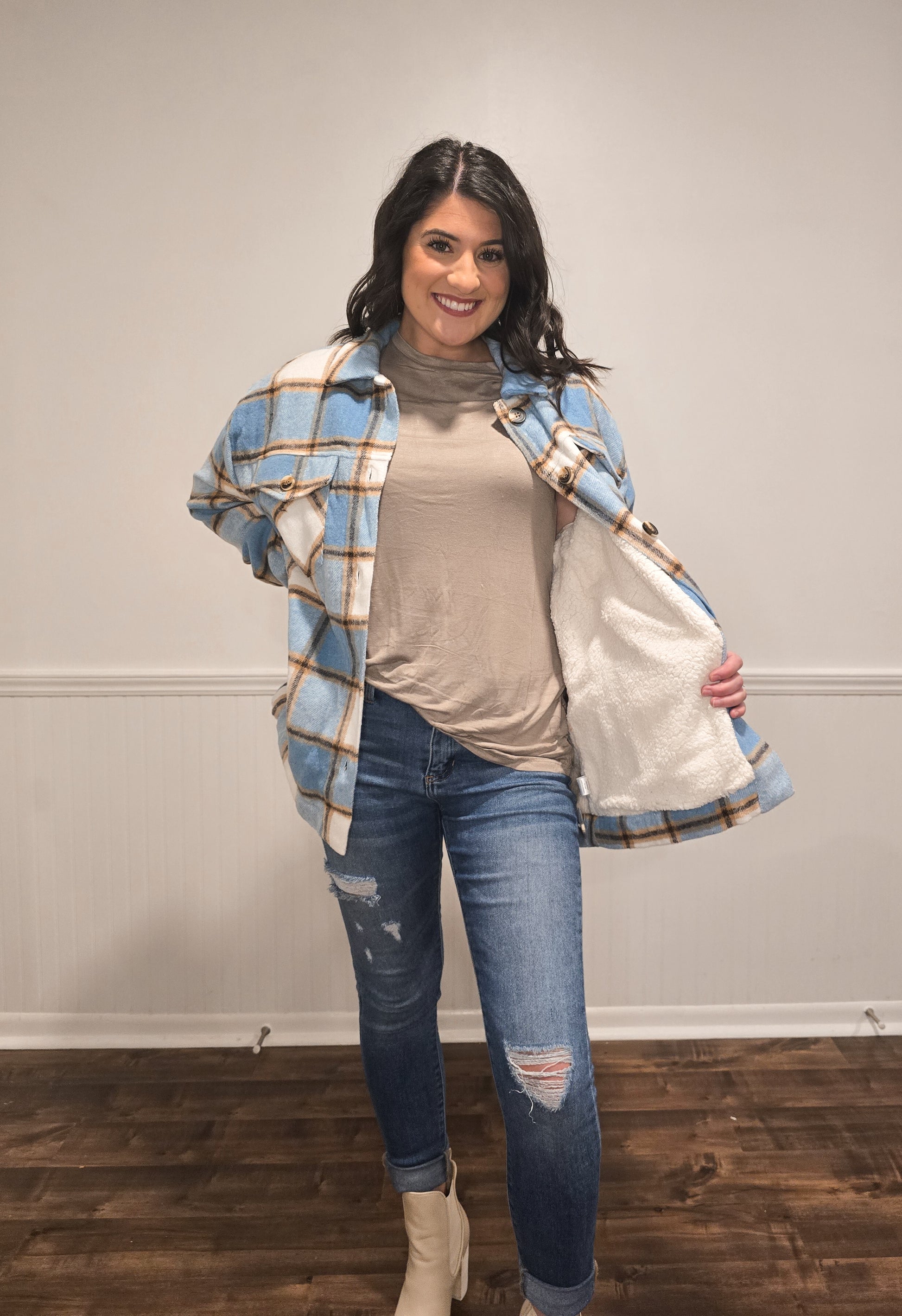 This shacket is so perfect to add some color to your winter wardrobe! The best part...the body is LINED WITH SHERPA (the sleeves are not lined with sherpa). If you want to stay warm on those cold nights, you need this super warm and cozy shacket! It features double breast pockets and side pockets!