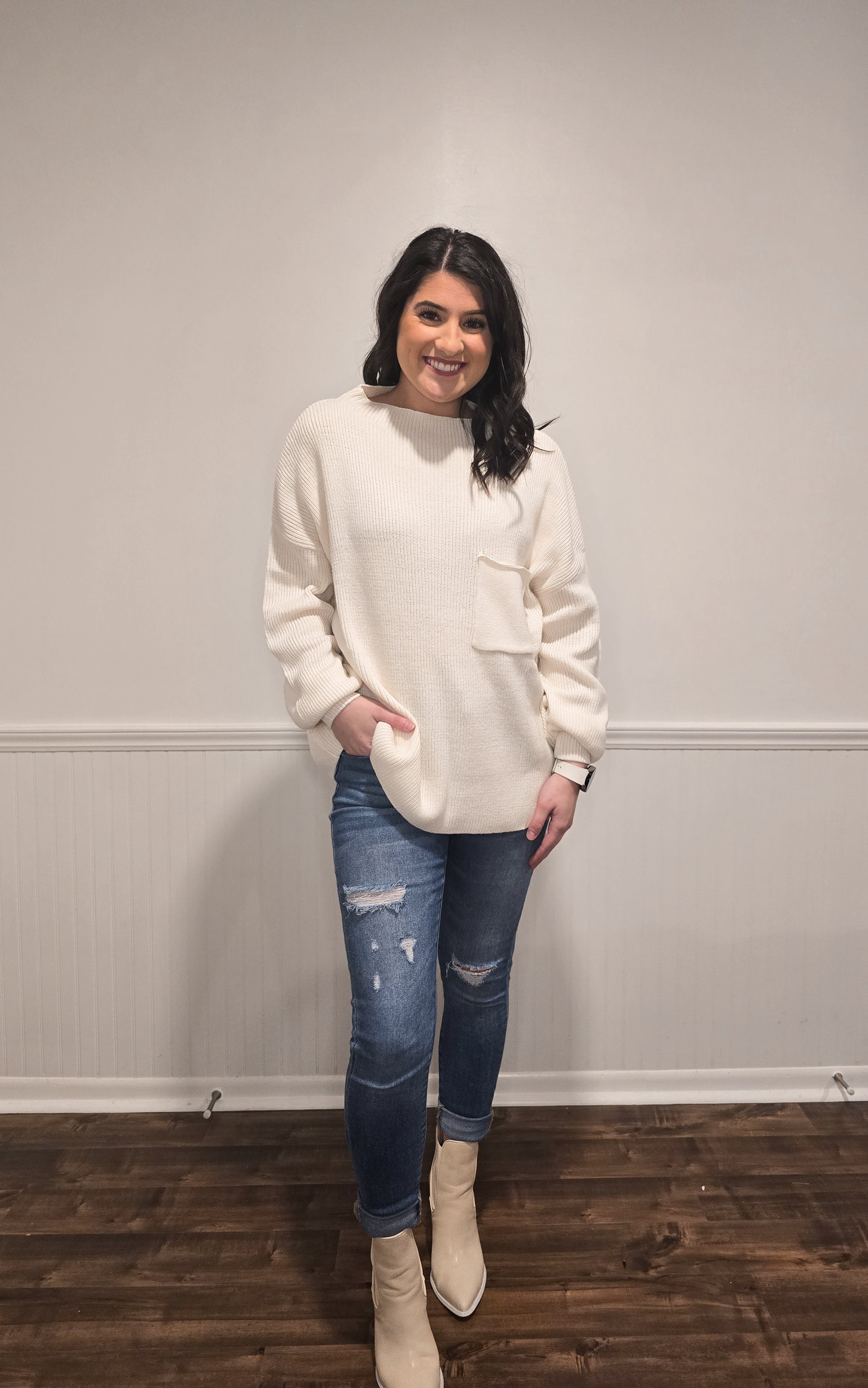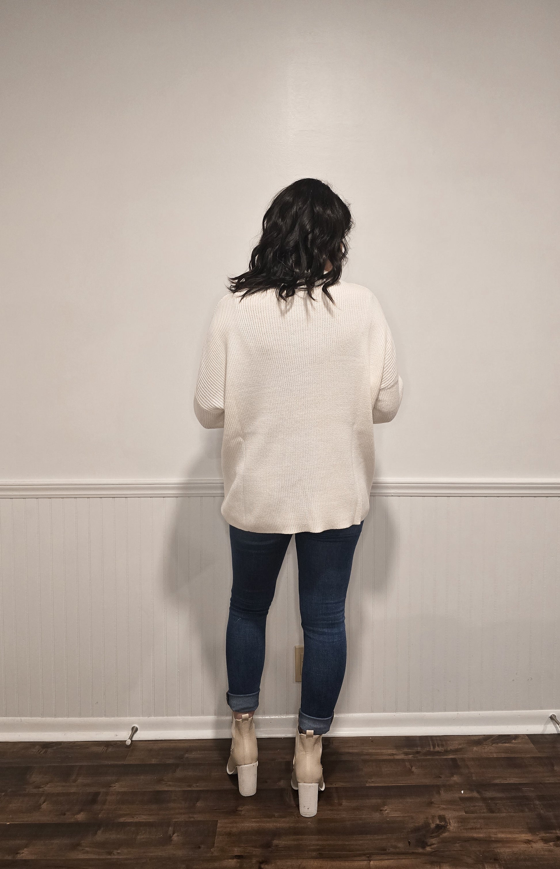 This funnel neck sweater is perfect for the holidays and the cool winter nights! Great for family pictures, holiday dinners, girls night out or date night! It has a pocket at the left breast area and drop shoulder hemlines. Fits a little oversized but we recommend ordering your true size.
